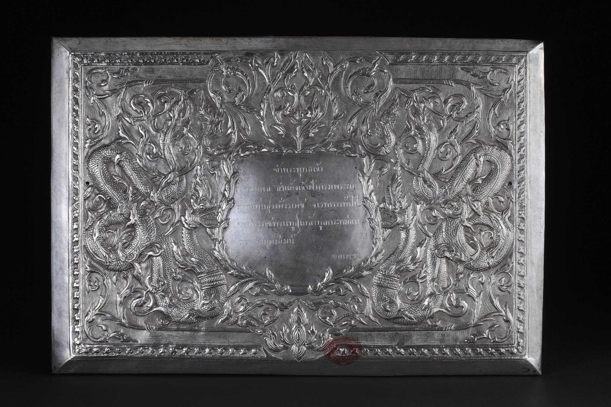 แผ่นโลหะเงินรูปทรงสี่เหลี่ยมดุนลาย กึ่งกลางเป็นสี่เหลี่ยมมุมมนคล้ายโล่ ภายในสลักข้อความว่า “ข้าพระพุทธเจ้า จอมพล สมเด็จเจ้าฟ้ากรมพระยาภาณุพันธุวงศ์วรเดช จเรทหารทั่วไป* ขอพระราชทานทูลเกล้าทูลกระหม่อมถวายสมุดเล่มนี้ ขอเดชะ” ขนาบทั้งสองข้างด้วยรูปพญานาคม้วนตัวท่ามกลางลายก้านขด ส่วนขอบตกแต่งด้วยแถบลายกระหนกใบเทศขนาดเล็กล้อมรอบทั้งสี่ด้าน