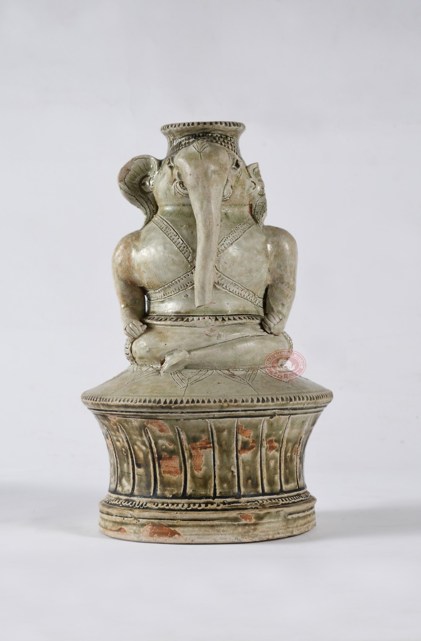 คนโทดินเผาเคลือบเขียว ปากกลม ฐานกลม ตัวภาชนะแบ่งออกเป็นสองส่วน ส่วนล่างเว้ายืดสูง ส่วนบนของภาชนะเป็นรูปพระคเณศ ๒ กร ประทับขัดสมาธิราบบนฐานบัวคว่ำ พระเศียรตกแต่งเป็นลายเส้นตารางซ้อนกันสามชั้น (สันนิษฐานว่าเลียนแบบกรัณฑมงกุฎ) พระเนตรเปิดมองตรง งวงยาวถึงพระนาภี พระกรรณใหญ่ พระหัตถ์ขวาทรงถือทันต์ หรืองาที่หัก พระอุระแสดงการทรงสังวาลไขว้กันเป็นกากบาท ทรงพระภูษาสั้น ลักษณะผ้าเป็นริ้วคล้ายผ้าพลีต รัดองค์ประดับแถบลายสามเหลี่ยม