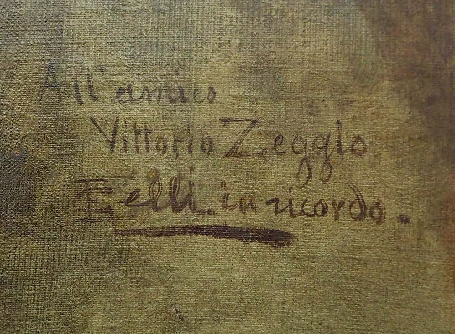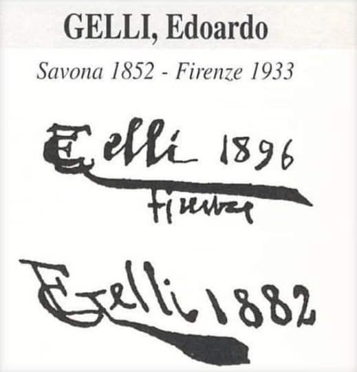 โดยตัวอักษร E (Edoardo) และ G (Gelli) ใบบรรทัดสุดท้ายเขียนซ้อนกัน ตามด้วยตัวอักษร elli แบบตัวเขียนภาษาอังกฤษ รวมเป็น E. Gelli หรือ Edoardo Gelli ซึ่งเป็นเอกลักษณ์ในการลงชื่อบนภาพเขียนของเยลลี (ภาพที่ 3) ส่วนวิตตอริโอ เซจโจ้ (Vittorio Zeggio) คนนี้คือ กงสุลกิตติมศักดิ์แห่งราชอาณาจักรสยาม ผู้จัดการเรื่องการเสด็จประพาสอิตาลีของพระบาทสมเด็จพระจุลจอมเกล้าเจ้าอยู่หัว เมื่อ พ.ศ. 2450 ขณะที่พระองค์ประทับอยู่ ณ บ้านของเซจโจ้ในเมืองฟลอเรนซ์ เซจโจ้ได้จัดการให้พระองค์ทรงพบปะกับจิตรกรและประติมากรชาวอิตาเลียนที่มีชื่อเสียงในขณะนั้นหลายคน นอกจากนี้ ยังทรงประทับเป็นแบบให้จิตรกรได้เขียนพระบรมสาทิสลักษณ์ระหว่างเสด็จฯ เยือนสตูดิโอด้วยความอดทน