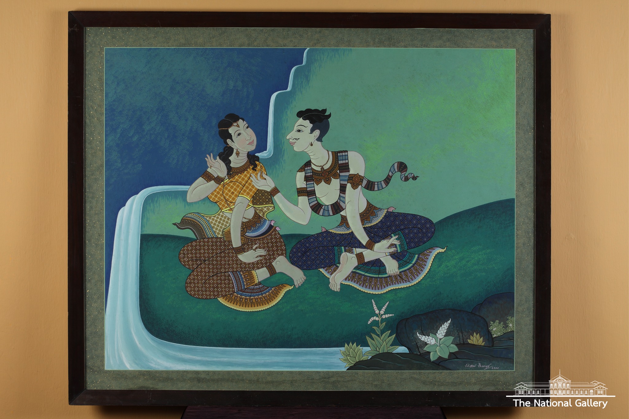 ‘ริมธารรัก’ (พ.ศ. 2502) เป็นงานจิตรกรรมแบบไทยประยุกต์ เขียนด้วยสีฝุ่นบนกระดานอัด (Masonite Board) แสดงภาพหนุ่มสาวนั่งหยอกล้อกันอยู่ริมน้ำตกและลำธาร การเขียนภาพบุคคลยังคงลักษณะอันเป็นเอกลักษณ์แบบไทยโบราณ เช่น การเขียนเค้าโครงใบหน้า และการแสดงท่าทางของบุคคลอย่างนาฏลักษณ์ (ท่าร่ายรำ) ผสมผสานกับการจัดองค์ประกอบภาพแบบงานศิลปะตะวันตก ซึ่งแตกต่างจากงานจิตรกรรมแบบไทยประเพณีโดยทั่วไป ประสงค์ลงสีรูปบุคคลเพื่อสร้างแสงเงาบนใบหน้าและร่างกายให้มีลักษณะเหมือนจริง ท่าทางของหนุ่มสาวที่นั่งหยอกล้อกันมีความนุ่มนวลอ่อนช้อย ประกอบกับบรรยากาศของริมธารน้ำที่ใช้สีเขียว ฟ้า และน้ำเงิน ซึ่งเป็นสีโทนเย็นไล่น้ำหนักอ่อนแก่ที่บริเวณพื้นหลัง สร้างบรรยากาศยามเย็นที่แดดร่มลมตกให้มีความรื่นรมย์มากยิ่งขึ้น ในปีเดียวกันนั้น ท่านได้เขียนภาพ ‘จันทร์แรม’ (พ.ศ. 2502) ซึ่งจัดแสดงอยู่คู่กันใน นิทรรศการพิเศษ “100 ปี ศิลปสู่สยาม สุนทรียศิลปแห่งนวสมัย” (ภาพอยู่ในคอมเมนต์)