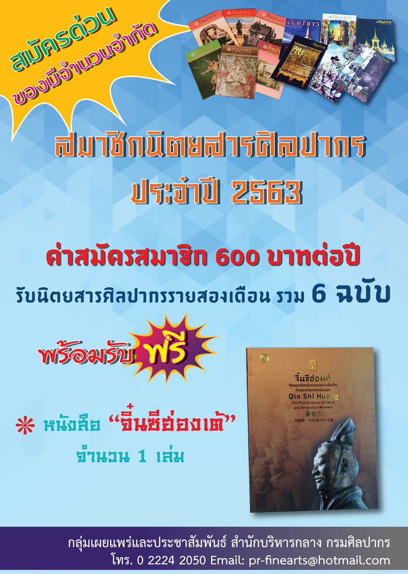 กรมศิลปากรขอเชิญผู้สนใจสมัครเป็นสมาชิกนิตยสารศิลปากรรายปี ราคาปีละ ๖๐๐ บาท (ค่าจัดส่งฟรี) พร้อมรับหนังสือ จิ๋นซีฮ่องเต้ : จักรพรรดิองค์แรกของแผ่นดินกับกองทัพทหารดินเผา จำนวน ๑ เล่ม ฟรี (จำนวนจำกัด) สมัครด้วยตัวเองได้ที่กลุ่มเผยแพร่และประชาสัมพันธ์ สำนักบริหารกลาง กรมศิลปากร หรือ โอนเงินเข้าบัญชีธนาคารกรุงไทย สาขาถนนข้าวสาร ชื่อบัญชี "นิตยสารศิลปากร" เลขที่บัญชี 018-0-05671-9 ส่งใบสมัครและหลักฐานการโอนเงินไปยัง Email: pr-finearts@hotmail.com โทรศัพท์/โทรสาร ๐ ๒๒๒๒ ๓๕๖๙, ๐ ๒๒๒๒ ๐๙๓๔