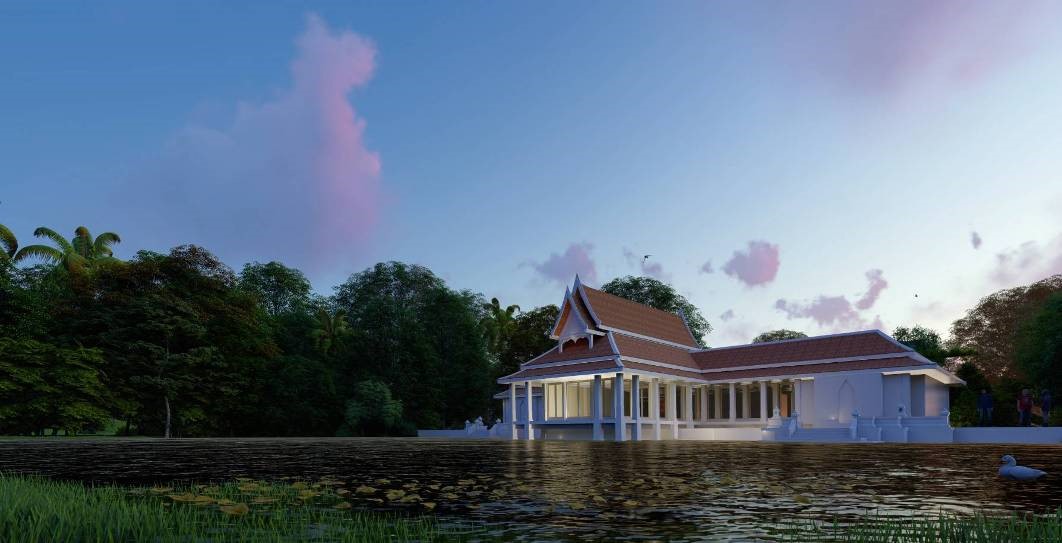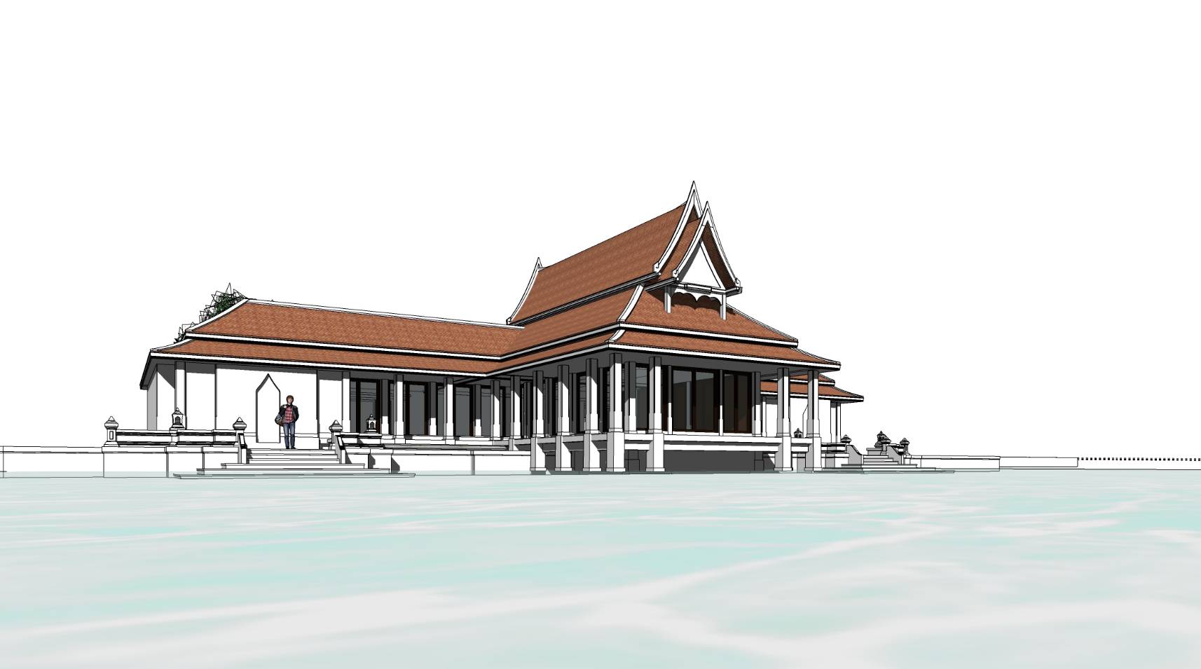 แบบทัศนียภาพอาคารจัดแสดงหลังใหม่ของพิพิธภัณฑสถานแห่งชาติ ไชยา ซึ่งสถาปนิกได้รับแรงบันดาลใจจากรูปแบบอุโบสถวัดจำปา ซึ่งเป็นโบราณสถานสำคัญของเมืองไชยา