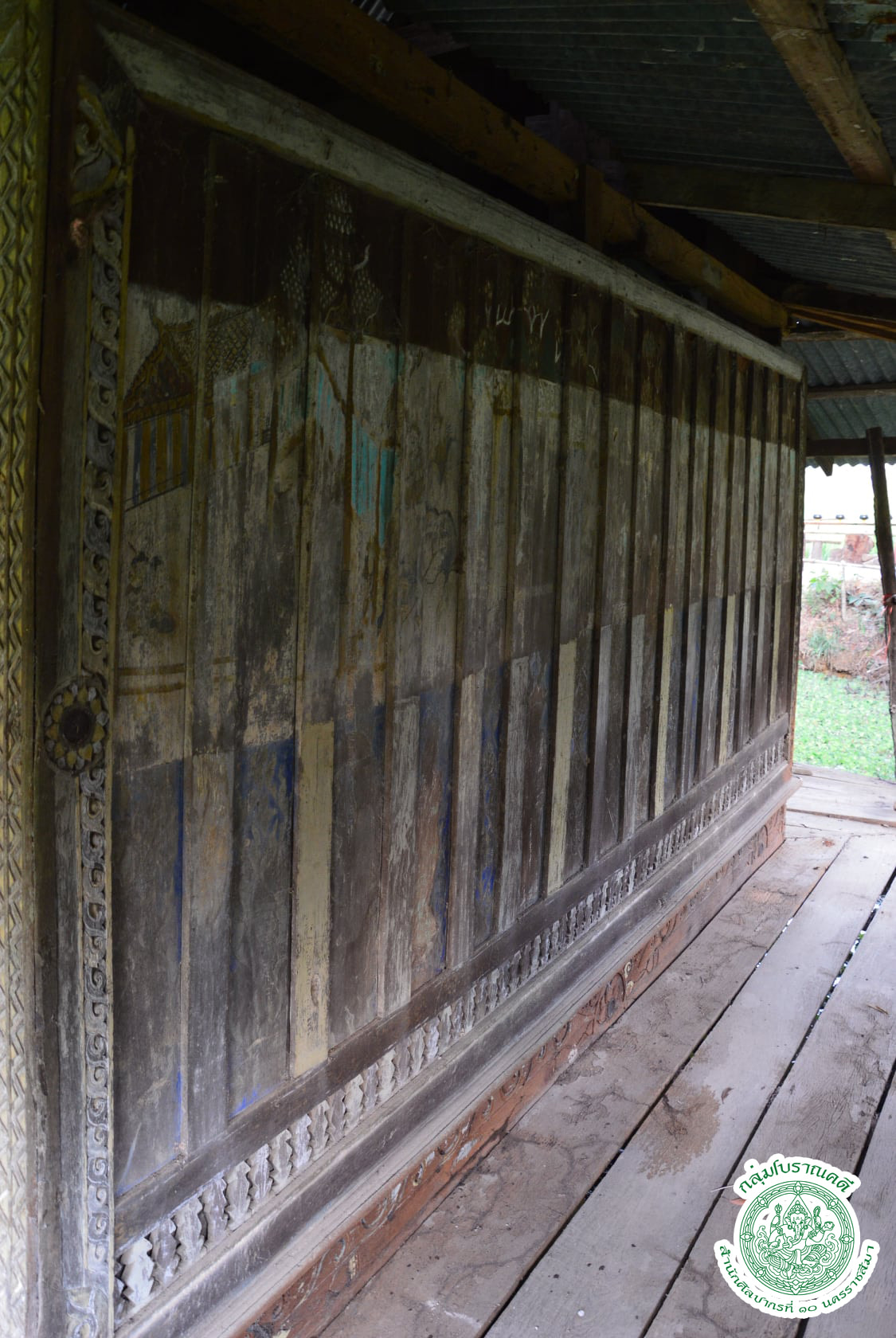#หอไตรวัดศรีมงคล ตั้งอยู่นอกวัดศรีมงคล อำเภอศิลาลาด #จังหวัดศรีสะเกษ โดยตั้งอยู่ทางด้านทิศใต้ของวัด ห่างวัดมาประมาณ ๑๐๐ เมตร ลักษณะเป็นหอไตรกลางน้ำ บริเวณโดยรอบเป็นที่นา หอไตรตั้งอยู่กลางสระน้ำมีความกว้างประมาณ ๒๐X๒๐ เมตร หอไตรเป็นอาคารทรงสี่เหลี่ยมมีขนาดประมาณ ๓.๙๐X๓.๒๐ เมตร มีระเบียงโดยรอบออกเดินรอบได้มาอีกด้านละ ๑.๕๐ เมตร มีประตู(ป่อง)ทางเข้าอยู่ทางด้านทิศตะวันออก ไม่มีหน้าต่าง ผนังมีความสูงประมาณ ๒ เมตร เขียนภาพจิตรกรรมบนพื้นไม้ไว้โดยรอบ ค่อนข้างจะลบเลือนโดยเฉพาะทางด้านทิศเหนือ ที่ตอนล่างของผนัง มุมอาคาร และกรอบประตู แกะสลักขอบไม้เป็นลายประดับอยู่ตลอดแนว มีการประดับลายด้วยกระจกกลม