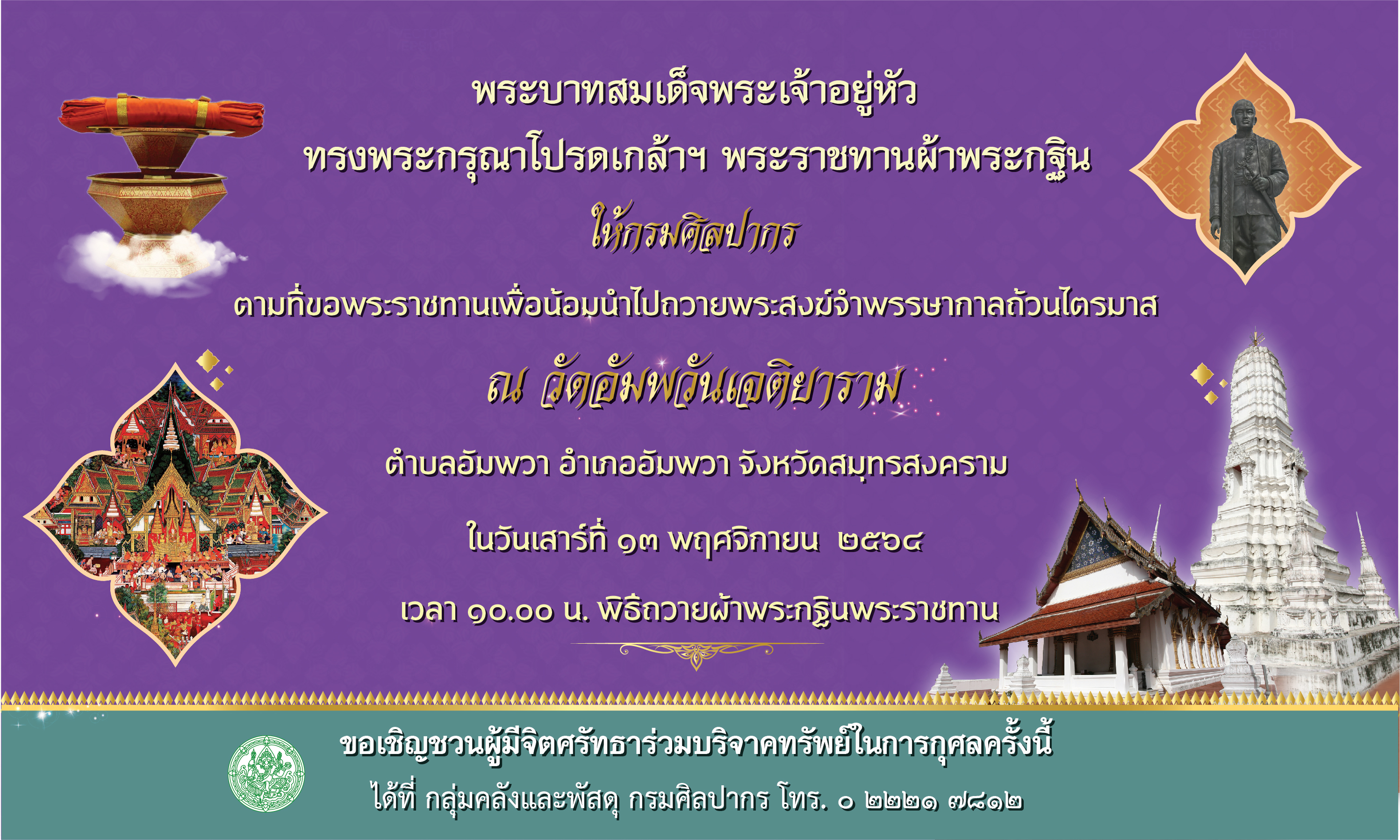 ด้วยพระบาทสมเด็จพระเจ้าอยู่หัว ทรงพระกรุณาโปรดเกล้าฯ ให้กรมศิลปากรรับผ้าพระกฐินพระราชทาน ประจำปี ๒๕๖๔ นำไปถวาย ณ วัดอัมพวันเจติยาราม ตำบลอัมพวา อำเภออัมพวา จังหวัดสมุทรสงคราม ในวันเสาร์ที่ ๑๓ พฤศจิกายน ๒๕๖๔ เวลา ๑๐.๐๐ น. โดยจะมีพิธีสมโภชองค์พระกฐิน ในวันศุกร์ที่ ๑๒ พฤศจิกายน ๒๕๖๔ เวลา ๑๘.๐๐ น. จึงขอเชิญชวนผู้มีจิตศรัทธาร่วมบริจาคทรัพย์ หรือสิ่งของ โดยเสด็จพระราชกุศลในการถวายผ้าพระกฐินพระราชทานกรมศิลปากร ประจำปี ๒๕๖๔ ได้ที่ กลุ่มคลังและพัสดุ สำนักบริหารกลาง กรมศิลปากร ในกรณีส่งธนาณัติ หรือ ตั๋วแลกเงินไปรษณีย์ โปรดสั่งจ่ายในนาม ผู้อำนวยการกลุ่มคลังและพัสดุ กรมศิลปากร ณ ที่ทำการไปรษณีย์หน้าพระลาน กทม. ๑๐๒๐๐ หรือโอนเข้าบัญชีธนาคารออมสิน สาขาหน้าพระลาน บัญชีเลขที่ ๐ ๕ ๐ ๕ ๗ ๐ ๓ ๔ ๕ ๕ ๙ ๐ ชื่อบัญชี การกุศลกรมศิลปากร ประเภทเงินฝากออมทรัพย์ ตั้งแต่บัดนี้จนถึงวันที่ ๑๕ ตุลาคม ๒๕๖๔ ทั้งนี้ กรมศิลปากรจะได้รวบรวมนำเข้าสมทบถวายบำรุงพระอารมหลวงวัดอัมพวันเจติยาราม และขอรับใบอนุโมทนาบัตรต่อไป สอบถามเพิ่มเติม โทร. ๐ ๒๒๒๑ ๗๘๑๒