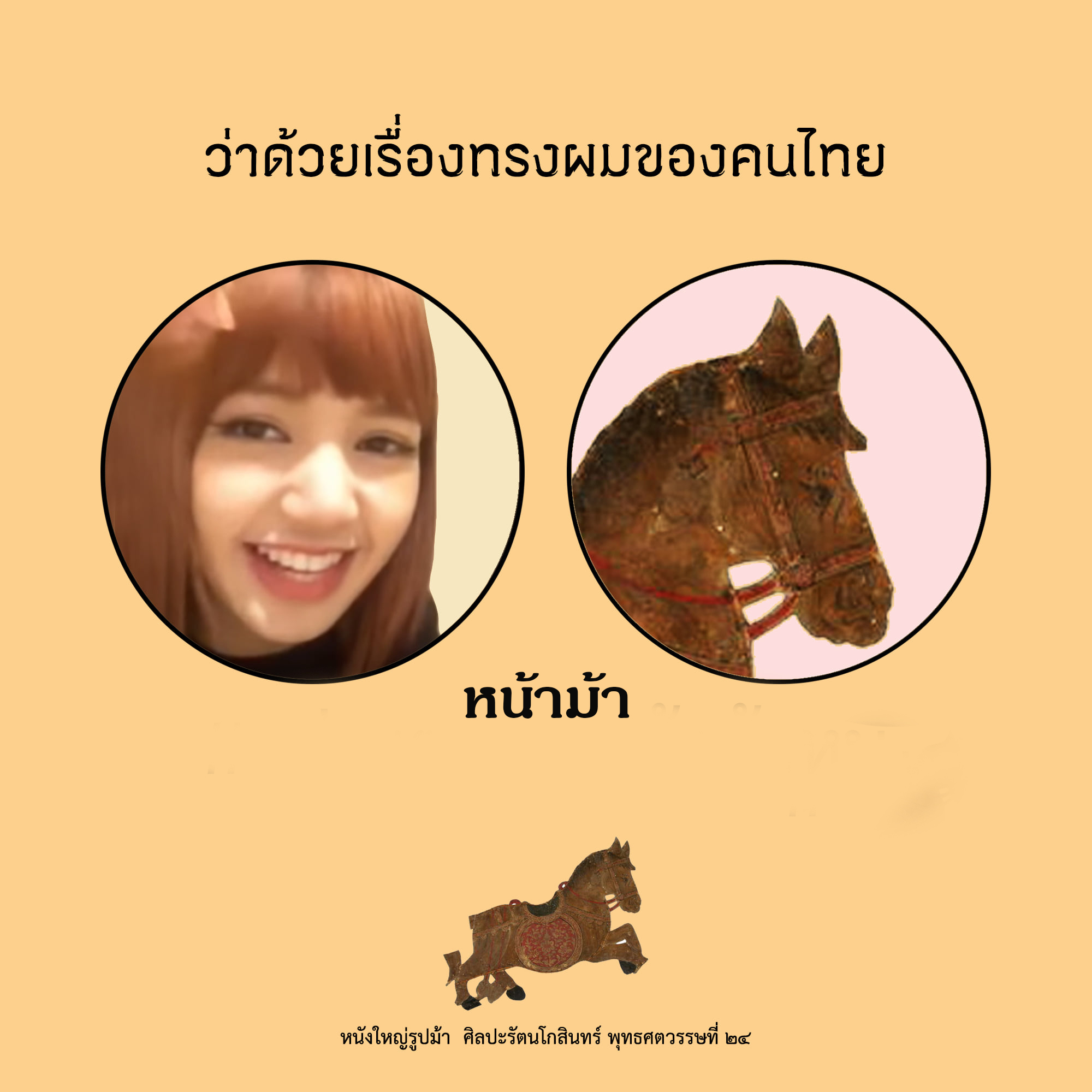 ภาพที่ ๑ ภาพเปรียบเทียบทรงผมม้าของลิซ่า ภาพจากแอปพลิเคชัน Tiktok กับหนังใหญ่รูปม้า คลังกลางพิพิธภัณฑสถานแห่งชาติ