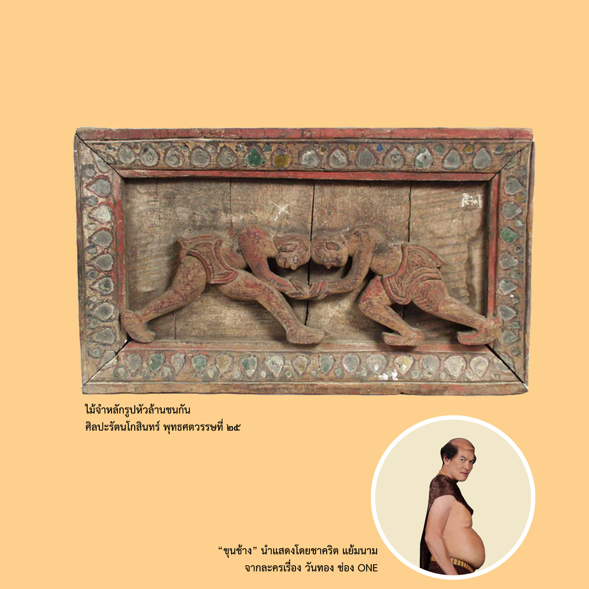 ภาพที่ ๓ ไม้แกะสลักรูปหัวล้านชนกัน คลังกลางพิพิธภัณฑสถานแห่งชาติ กับ “ขุนช้าง” จากละครโทรทัศน์ เรื่อง “วันทอง” ภาพจาก www.one31.net