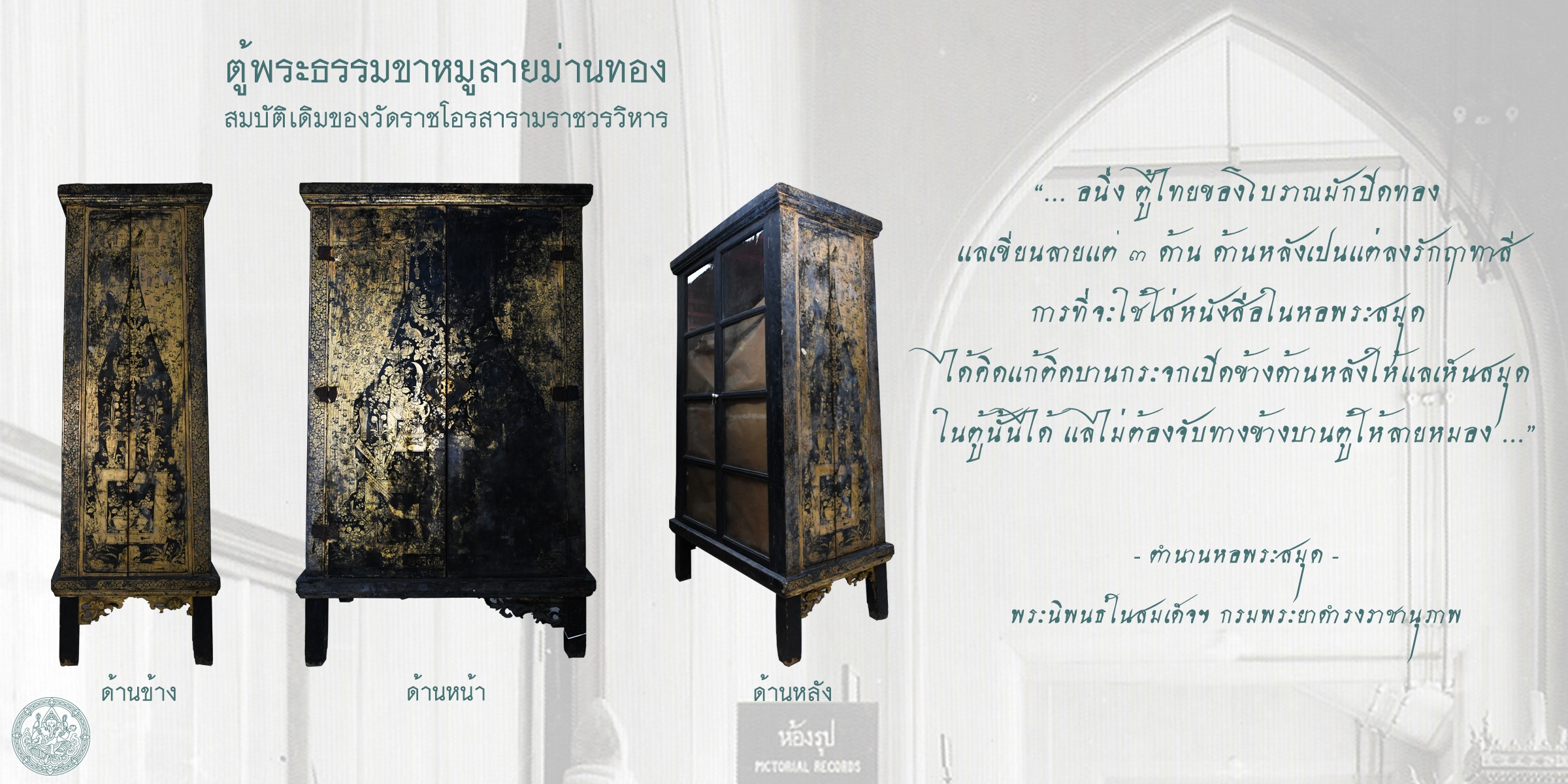 นอกจากนี้ ยังมีการอนุรักษ์ตู้พระธรรมเหล่านั้นให้ทรงคุณค่า พร้อมทั้งยังนำมาใช้การได้ ดังที่สมเด็จฯ กรมพระยาดำรงราชานุภาพ ทรงอธิบายไว้ในพระนิพนธ์ เรื่อง ตำนานหอพระสมุด ระบุว่า “... อนึ่ง ตู้ไทยของโบราณมักปิดทองแลเขียนลายแต่ ๓ ด้าน ด้านหลังเปนแต่ลงรักฤาทาสี การที่จะใช้ใส่หนังสือในหอพระสมุดฯ ได้คิดแก้ติดบานกระจกเปิดข้างด้านหลังให้แลเห็นสมุดในตู้นั้นได้ แลไม่ต้องจับทางข้างบานตู้ให้ลายหมอง ...” มีตัวอย่างเป็นตู้ชิ้นสำคัญ เป็นตู้ขาหมู ลายม่านทอง เครื่องกี๋จีน ด้านหลังเป็นกระจก เก็บรักษาอยู่ที่คลังกลางฯ ศิลปะสมัยรัตนโกสินทร์ มีประวัติระบุว่า “สร้างประดิษฐ์ไว้ในหอไตรวัดราชโอรสมีอยู่ ๓ ใบ ถูกฝนและปลวกผุทั้งหนังสือหมด คงใช้ได้ ๑ ใบ พระเจ้าบรมวงศ์เธอ กรมพระยาดำรงราชานุภาพ สภานายกหอพระสมุดสำหรับพระนคร มีรับสั่งให้ย้ายมารักษาไว้ ณ หอพระมณเฑียรธรรมสำหรับเก็บพระไตรปิฎกหอพระพุทธศาสนาต่อไป” ซึ่งลายม่านนี้ ยังสอดคล้องกับความนิยมเขียนม่านประดับในงานจิตรกรรมสมัยรัชกาลที่ ๓ - รัชกาลที่ ๔ ด้วย