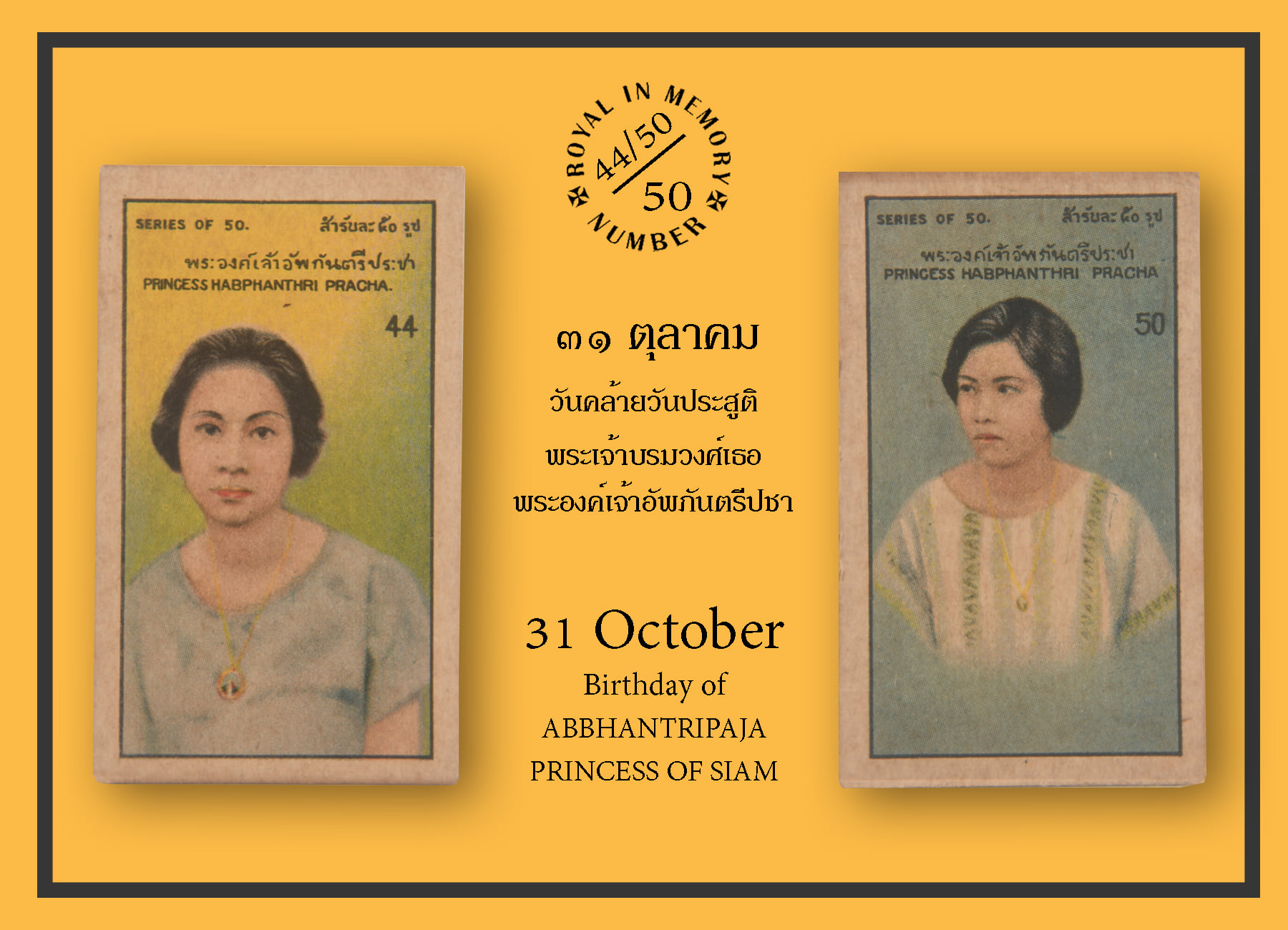 Cigarette Cards ชุดเจ้านายไทย (๑ สำรับ ประกอบด้วย พระบรมฉายาสาทิสลักษณ์ พระฉายาสาทิสลักษณ์ และรูปเขียนคล้ายพระรูปพระบรมวงศานุวงศ์บนแผ่นกระดาษ จำนวน ๕๐ รูป) ลำดับที่ ๔๔, ๕๐ โดยบริษัท ยาสูบซำมุ้ย จำกัด (SUMMUYE & CO) ผลิตราวปี พ.ศ. ๒๔๗๗ (หมายเลขทะเบียน ๒/๒๕๑๖/๑) มีประวัติระบุว่า คุณหลวงฉมาชำนิเขต มอบให้เมื่อวันที่ ๙ มกราคม ๒๕๑๖