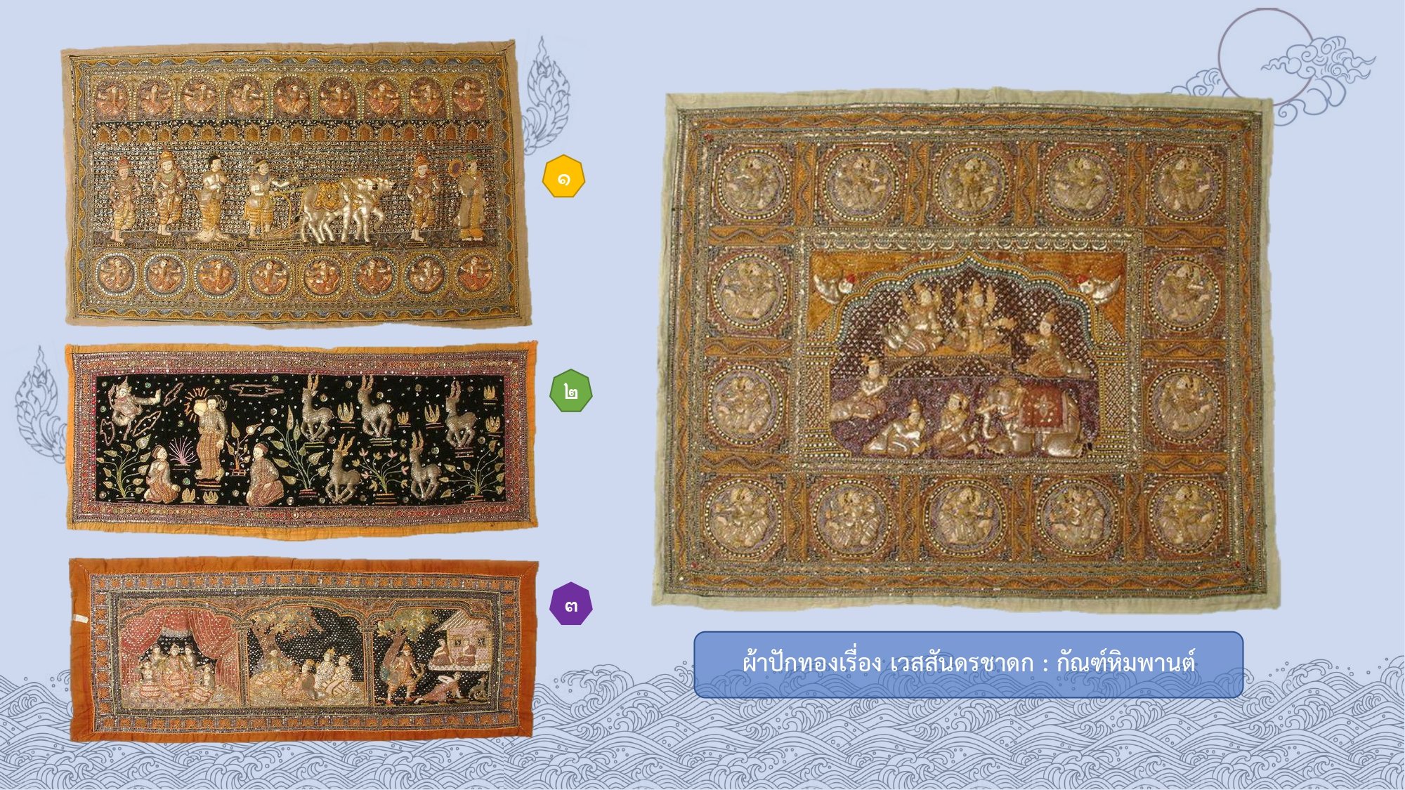 ภาพที่ ๓ (ซ้าย) ๑. ผ้าปักลายพระราชพิธีจรดพระนังคัลแรกนาขวัญ / ๒ - ๓ ผ้าปักเรื่องสุวรรณสามชาดก