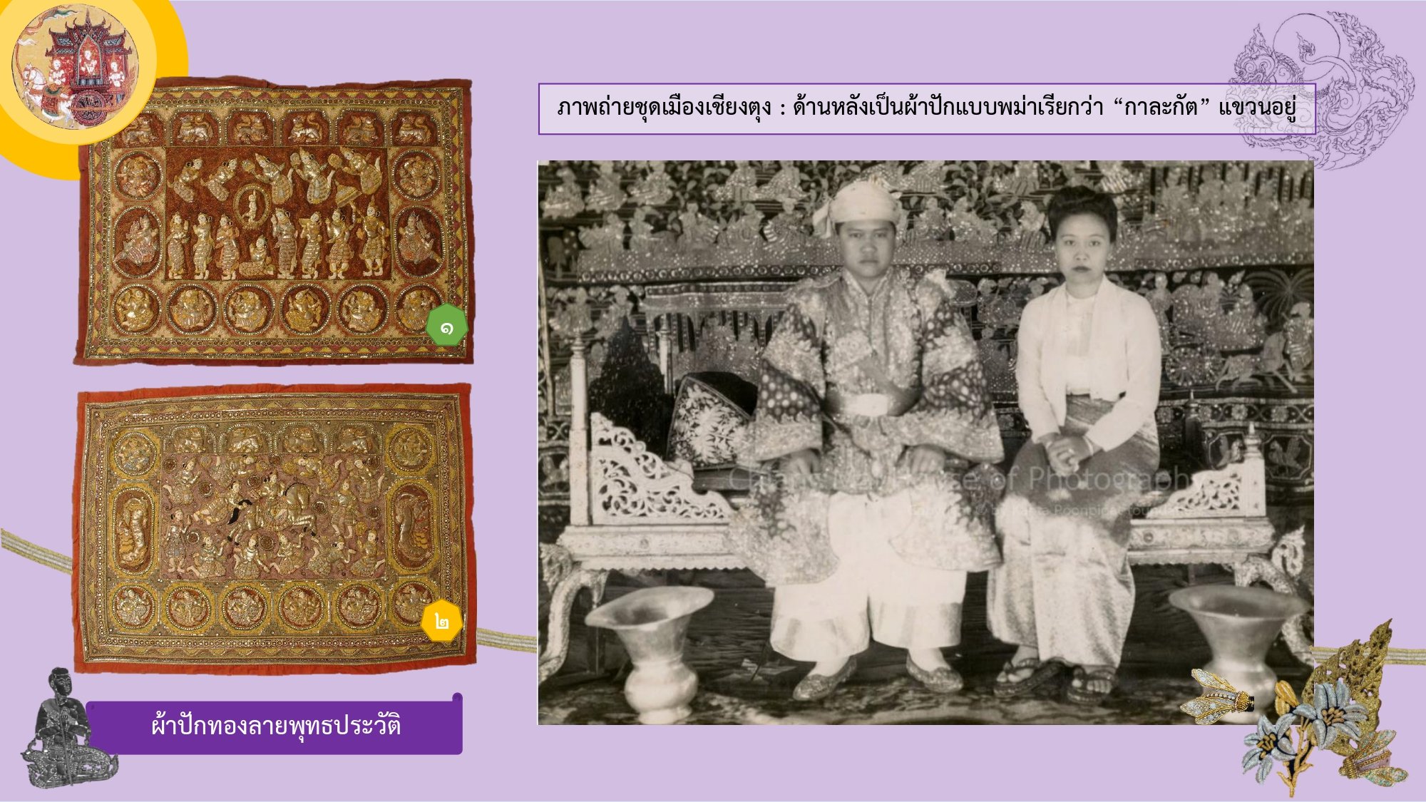 ภาพที่ ๒ (ซ้าย) ๑. ผ้าปักพุทธประวัติ ตอน ประสูติ / ๒. ผ้าปักพุทธประวัติ ตอน ออกมหาภิเนษกรมณ์ (ขวา) เจ้าฟ้าเสือห่มฟ้าเมืองแสนหวี และเจ้านางยุ่นจี่ ด้านหลังเป็นผ้าปัก “กาละกัต” ขนาดใหญ่แขวนอยู่ (ขอบคุณภาพถ่ายเก่าจาก หอภาพถ่ายล้านนา : Chiang Mai House of Photography by Associate Professor Kanta Poonpipat Foundation)