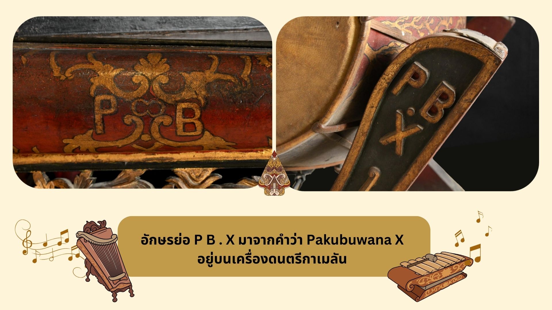 เครื่องดนตรีกาเมลันนี้ เป็นรูปแบบฝีมือช่างสุระการ์ตา มีอักษรย่อ “P.B X” มาจากคำว่า Pakubuwono X ใช้เรียกลำดับของผู้ครองนครสุระการ์ตา ทั้งนี้มีข้อน่าสังเกตของเครื่องดนตรีกาเมลันระหว่างราชสำนักสุระกาตาร์กับยอร์กยากาตาร์ คือการแกะสลักลวดลายบนเครื่องดนตรี โดยเครื่องดนตรีกาเมลันของสุระกาตาร์มักมีความซับซ้อนของลวดลาย มีเอกลักษณ์เป็นการฉลุโปร่งลายเถาวัลย์พืชและมังกร ส่วนทางยอร์กยากาตาร์จะนิยมสลักลวดลายพรรณพฤกษา นอกจากนี้ยังมีลูกระนาดของเครื่องดนตรีซารอน และจำนวนเครื่องดนตรีประกอบวงที่แตกต่างกันด้วย