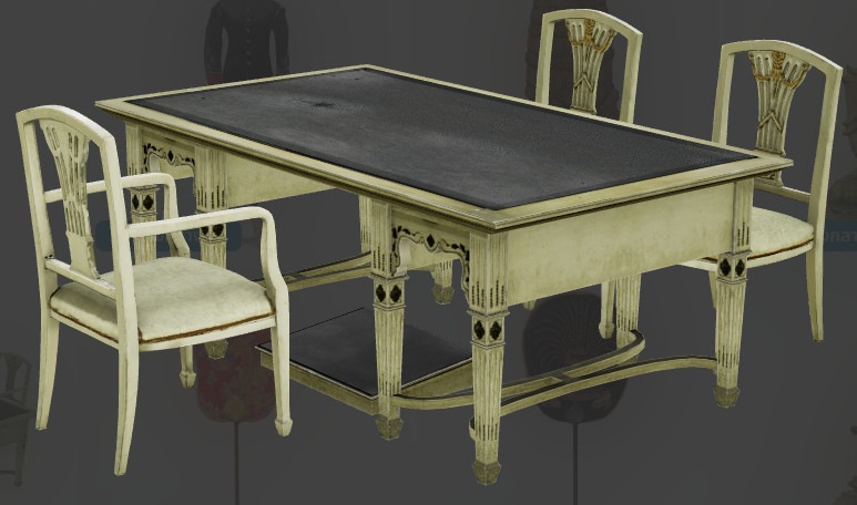 โต๊ะทรงพระอักษรทาสีขาวบุหนังสีแดง มีเก้าอี้หลัก 1 ตัว และเก้าอี้รอง 2 ตัว พร้อมรองพระบาท