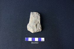 ขวานหินขัด มีบ่า ด้านหนึ่งขัดเรียบ อีกด้านหนึ่งมีรอยกะเทาะ |
