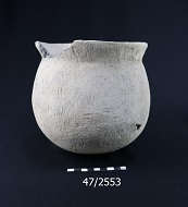 ภาชนะดินเผา ก้นกลม ปากกว้างผายออก ด้านในเรียบไม่มีลวดลาย ด้านนอกมีลายขูดขีดโดยรอบ สภาพชำรุด ขอบปากหักหายไปส่วนหนึ่ง ก้นทะลุ |