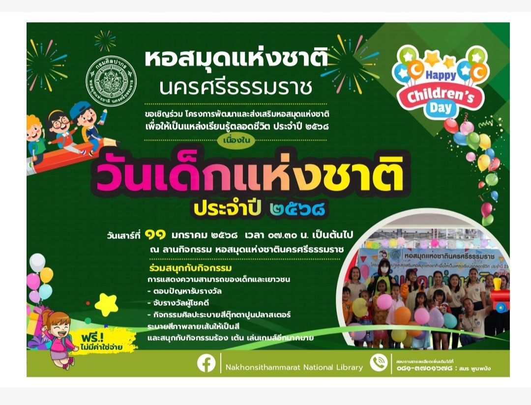 ขอเชิญร่วมโครงการพัฒนาและส่งเสริมหอสมุดแห่งชาติเพื่อให้เป็นแหล่งเรียนรู้ตลอดชีวิต (ทั้งส่วนกลางและส่วนภูมิภาค) ประจำปี ๒๕๖๘ เนื่องในวันเด็กแห่งชาติ วันเสาร์ที่ ๑๑ มกราคม ๒๕๖๘ ณ หอสมุดแห่งชาตินครศรีธรรมราช ตั้งแต่เวลา ๐๗.๓๐ น. เป็นต้นไป