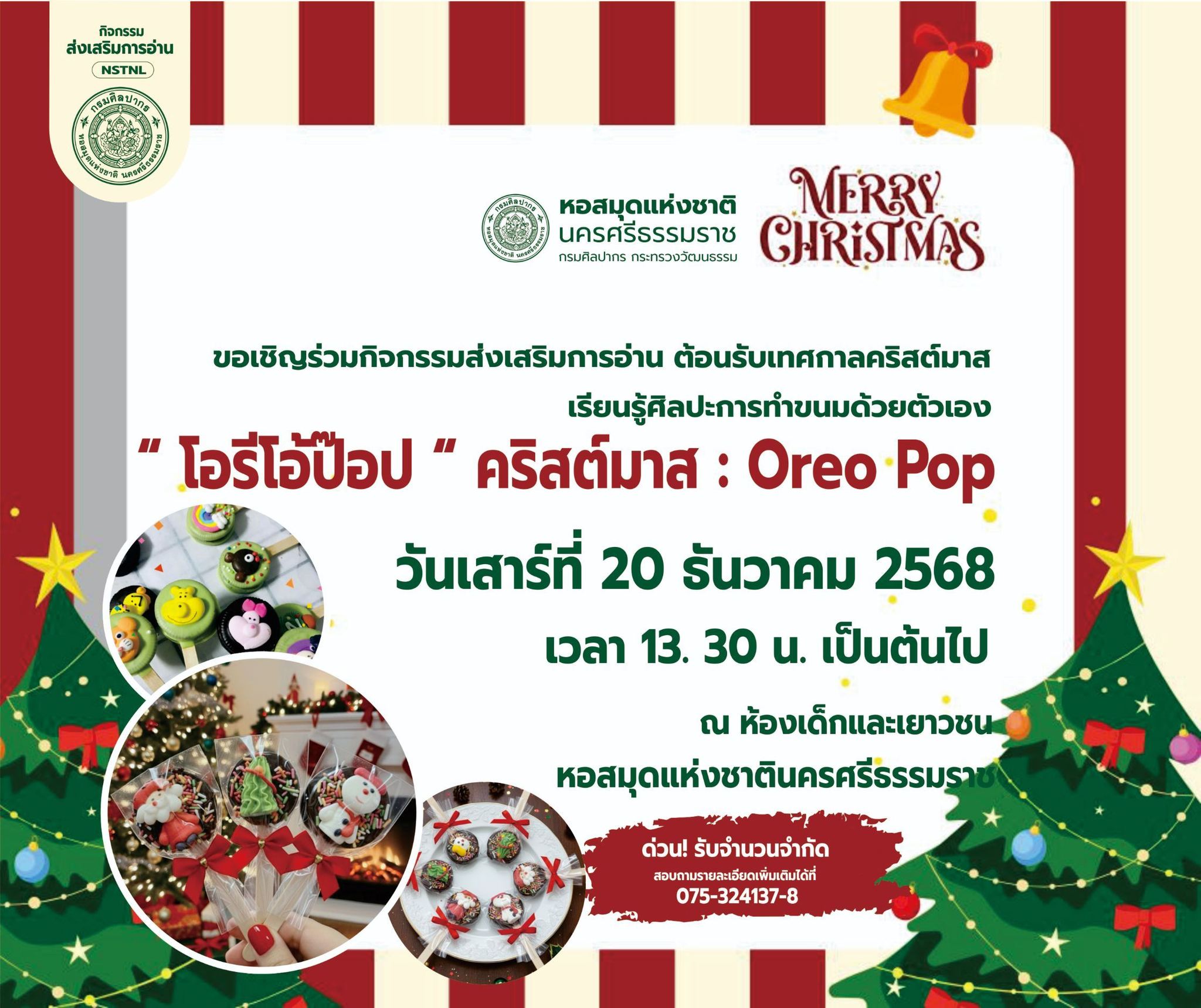 ขอเชิญร่วมกิจกรรมส่งเสริมการอ่าน รียนรู้ศิลปะการทำขนมด้วยตัวเอง กับหอสมุดแห่งชาตินครศรีธรรมราช วันเสาร์ที่ 20 ธันวาคม 2568 กิจกรรม "โอรีโอ้ป๊อป" คริสต์มาส : Oreo Pop รับจำนวนจำกัด สมัครได้ตั้งแต่วันนี้เป็นต้นไป