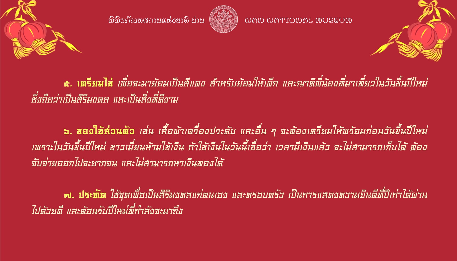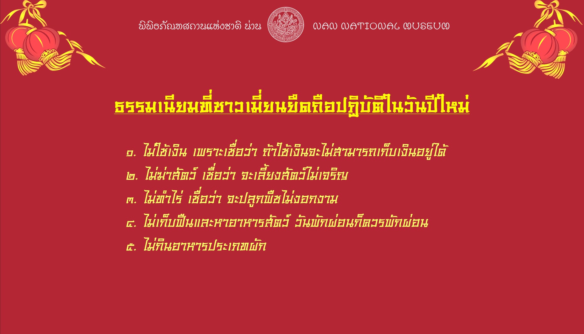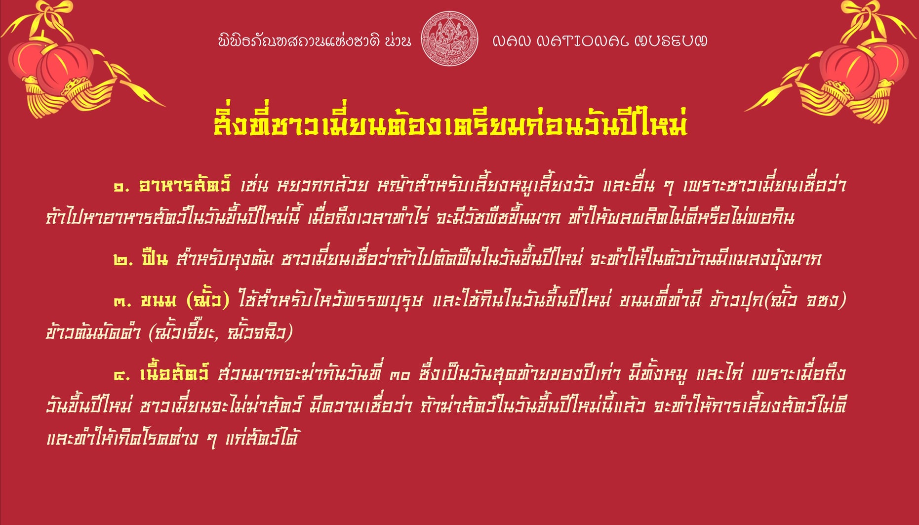 เพราะเมื่อถึงวันขึ้นปีใหม่แล้ว จะมีกฎข้อห้ามหลายอย่างที่ชาวเมี่ยนยึดถือและปฏิบัติกันต่อ ๆ กันมา