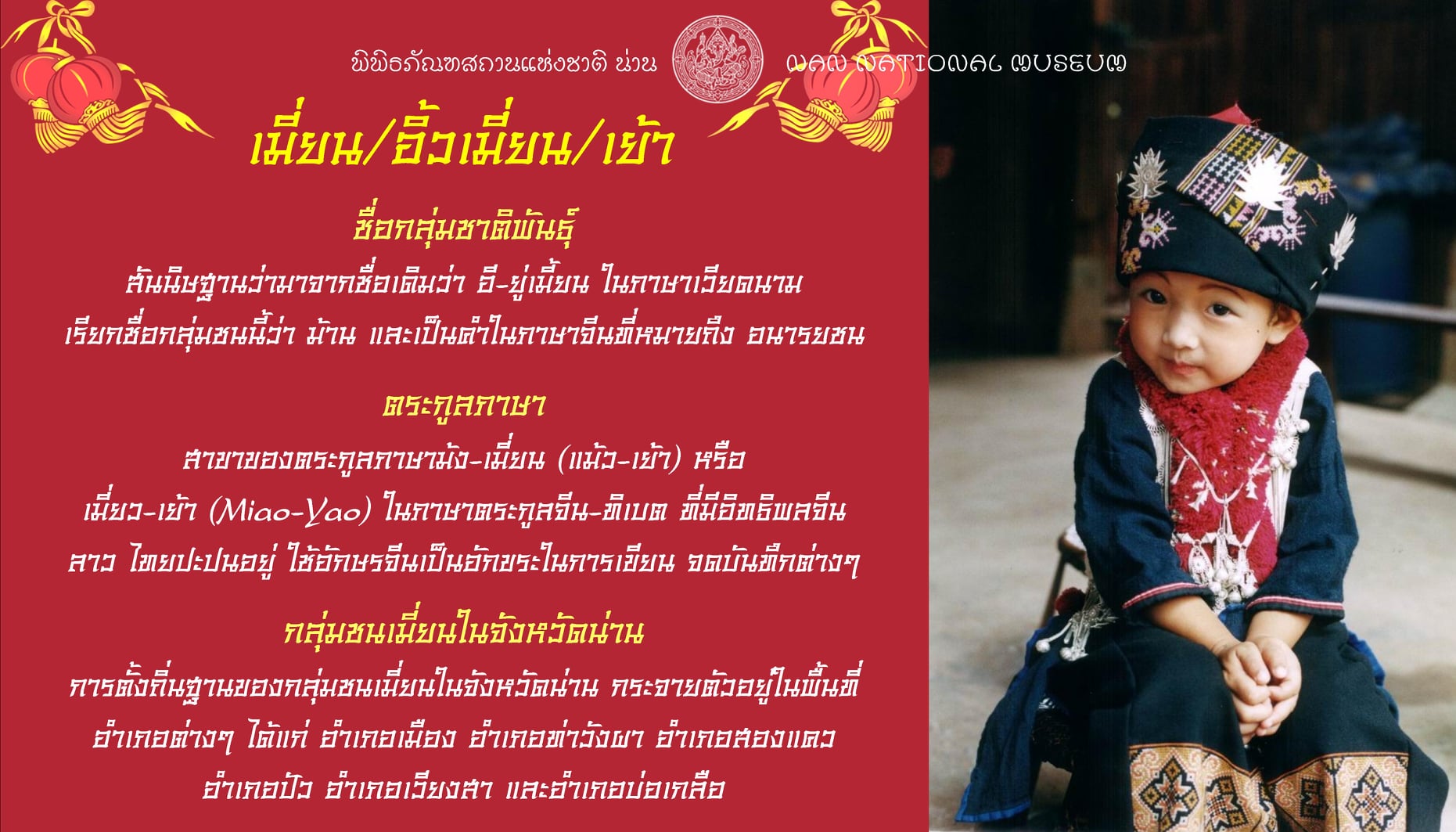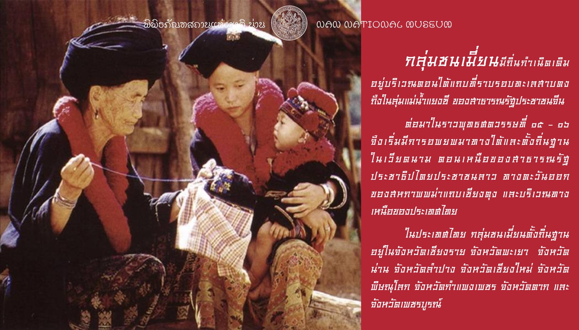 เพราะในจังหวัดน่านเอง ยังมี กลุ่มชาติพันธุ์อื่นๆที่ตั้งถิ่นฐานกระจายตัวอยู่ในพื้นที่อำเภอต่างๆ เช่น ม้ง ลัวะ มลาบรี ยวน เป็นต้น ที่ล้วนแล้วแต่มีวิถีชีวิตขนบธรรมเนียมประเพณีที่แตกต่างกัน ซึ่งพิพิธภัณฑสถานแห่งชาติ น่าน ก็คงจะได้นำเสนอเรื่องราวเกี่ยวกับกลุ่มชาติพันธุ์ในจังหวัดน่าน ในโอกาสต่อไป