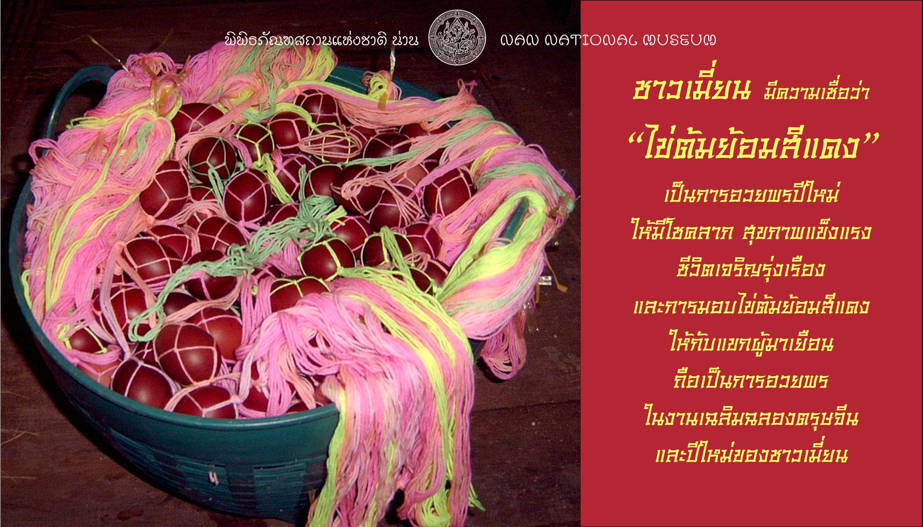 ชาวเมี่ยน มีความเชื่อว่า “ไข่ต้มย้อมสีแดง” เป็นการอวยพรปีใหม่ ให้มีโชคลาภ สุขภาพแข็งแรง ชีวิตเจริญรุ่งเรือง และการมอบไข่ต้มย้อมสีแดง
