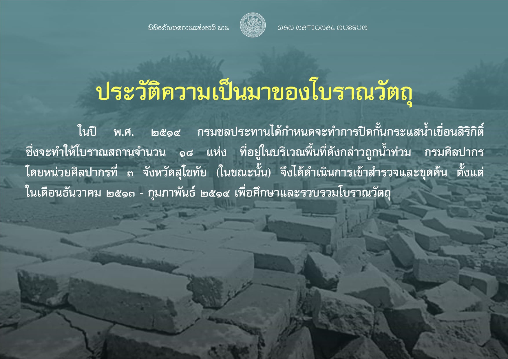 --- ในปี พ.ศ. ๒๕๑๔ กรมชลประทานได้กำหนดจะทำการปิดกั้นกระแสน้ำเขื่อนสิริกิติ์ ซึ่งจะทำให้โบราณสถานจำนวน ๑๘ แห่ง ที่อยู่ในบริเวณพื้นที่ดังกล่าวถูกน้ำท่วม กรมศิลปากร โดยหน่วยศิลปากรที่ ๓ จังหวัดสุโขทัย (ในขณะนั้น) จึงได้ดำเนินการเข้าสำรวจและขุดค้น ตั้งแต่ ในเดือนธันวาคม ๒๕๑๓ - กุมภาพันธ์ ๒๕๑๔ เพื่อศึกษาและรวบรวมโบราณวัตถุ