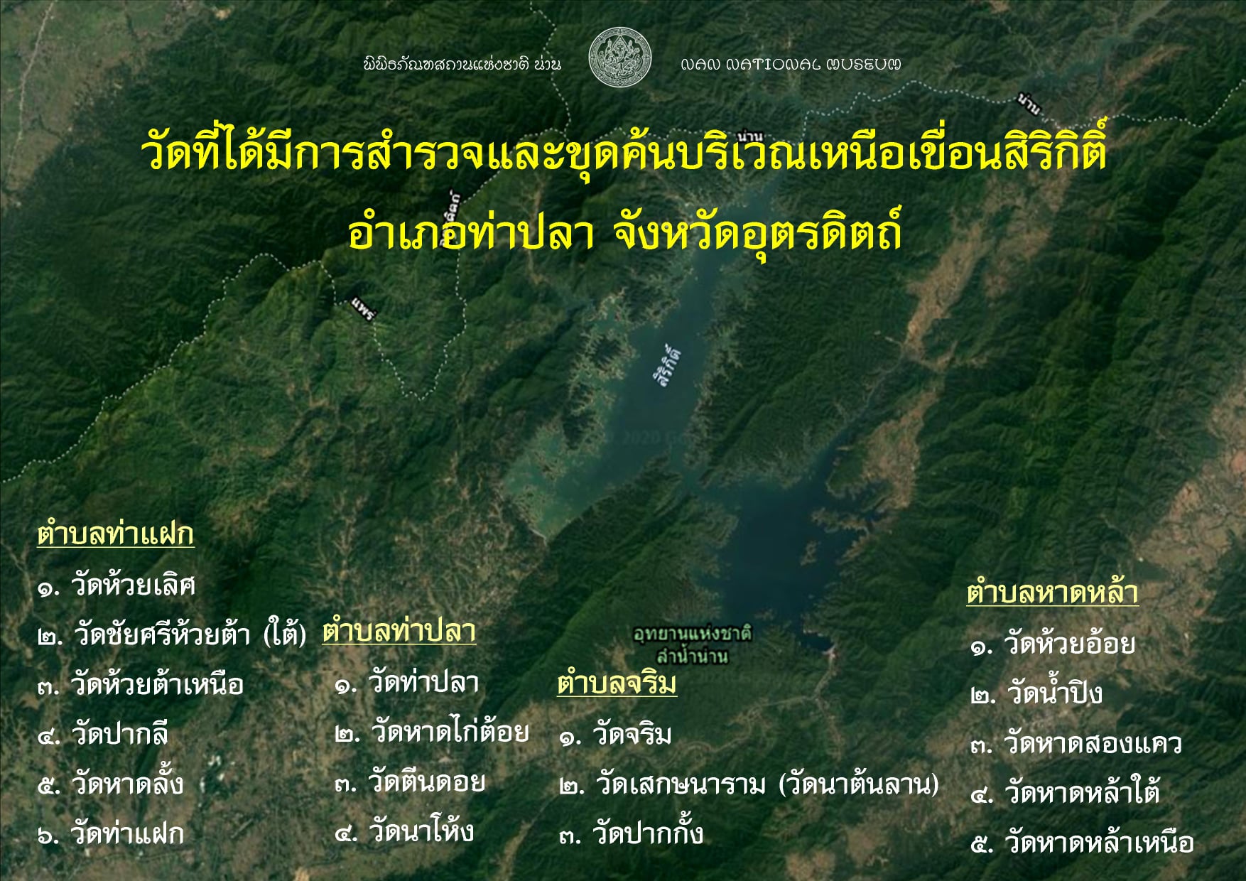 --- วัดที่ได้มีการสำรวจและขุดค้นบริเวณเหนือเขื่อนสิริกิติ์ อำเภอท่าปลา จังหวัดอุตรดิตถ์ จำนวน ๑๘ แห่ง ได้แก่ วัดห้วยเลิศ วัดชัยศรีห้วยต้า (ใต้) วัดห้วยต้าเหนือ วัดปากลี วัดหาดลั้ง วัดท่าแฝก วัดท่าปลา วัดหาดไก่ต้อย วัดตีนดอย วัดนาโห้ง วัดจริม วัดเสกษนาราม (วัดนาต้นลาน) วัดปากกั้ง วัดห้วยอ้อย วัดน้ำปิง วัดหาดสองแคว วัดหาดหล้าใต้ และวัดหาดหล้าเหนือ