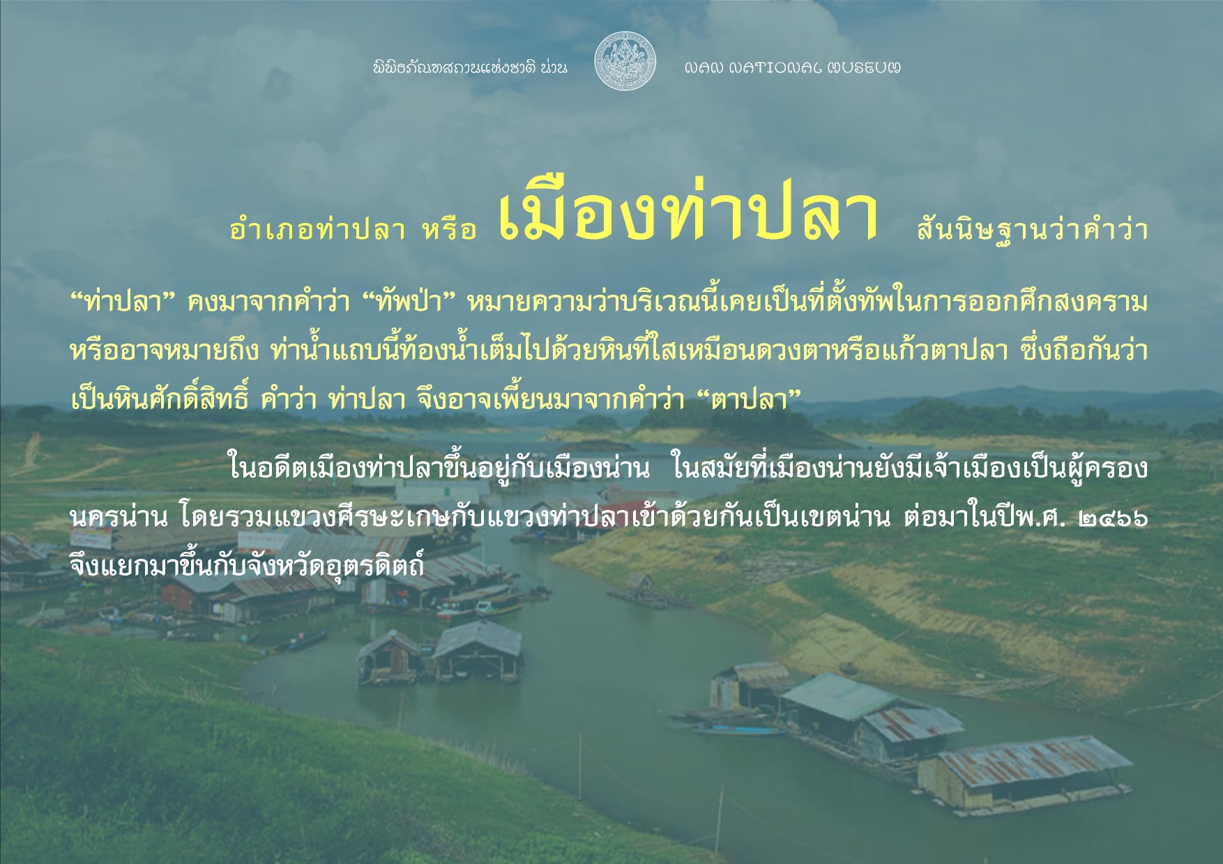 ปัจจุบันพิพิธภัณฑสถานแห่งชาติ น่าน จึงได้นำโบราณวัตถุบางส่วนที่พบจากการสำรวจและขุดค้นบริเวณเหนือเขื่อนสิริกิติ์ อำเภอท่าปลา จังหวัดอุตรดิตถ์ จัดแสดงให้เข้าชม ณ ห้องนิทรรศการชั่วคราวสมัยประวัติศาสตร์ ชั้นล่างของอาคารพิพิธภัณฑสถานแห่งชาติ น่าน