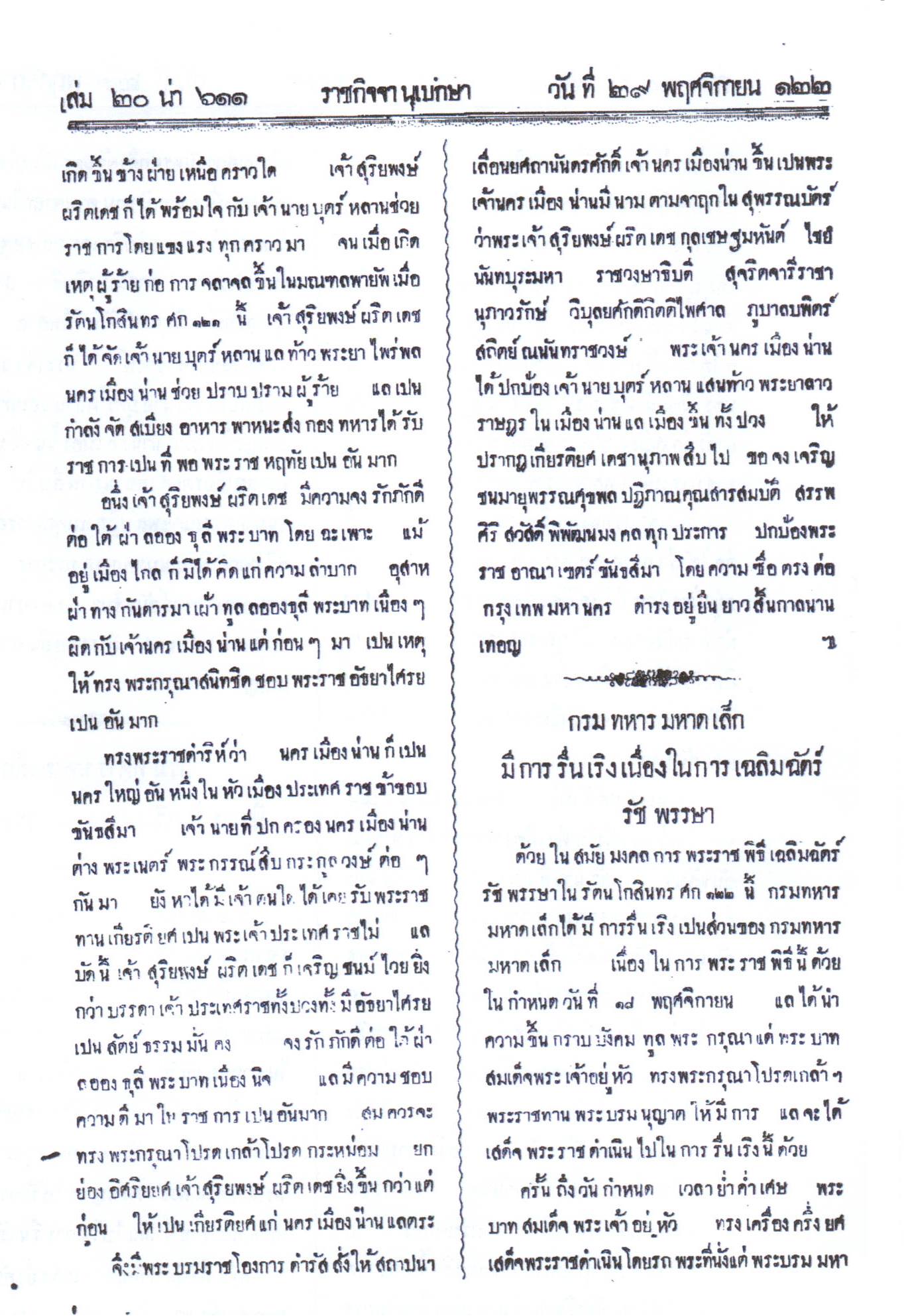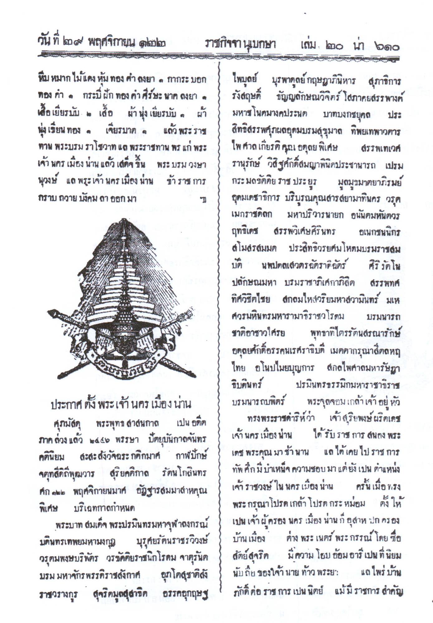18 พฤศจิกายน 2446 พระบาทสมเด็จพระจุลจอมเกล้าเจ้าอยู่หัว (รัชกาลที่ 5) โปรดเกล้าฯ ให้สถาปนาเลื่อนยศฐานันดรศักดิ์ขึ้นเป็นพระเจ้านครเมืองน่าน มีนามตามจารึกในพระสุพรรณบัฏ ว่า พระเจ้าสุริยพงษ์ผริตเดช กุลเชษฐมหันต์ ไชยนันทบุระมหาราชวงษาธิบดี สุจริตจารีราชานุภาวรักษ์ วิบูลยศักดิกิตติไพศาล ภูบาลบพิตร์ สถิตย์ ณ นันทราชวงษ์ พระเจ้านครน่าน
