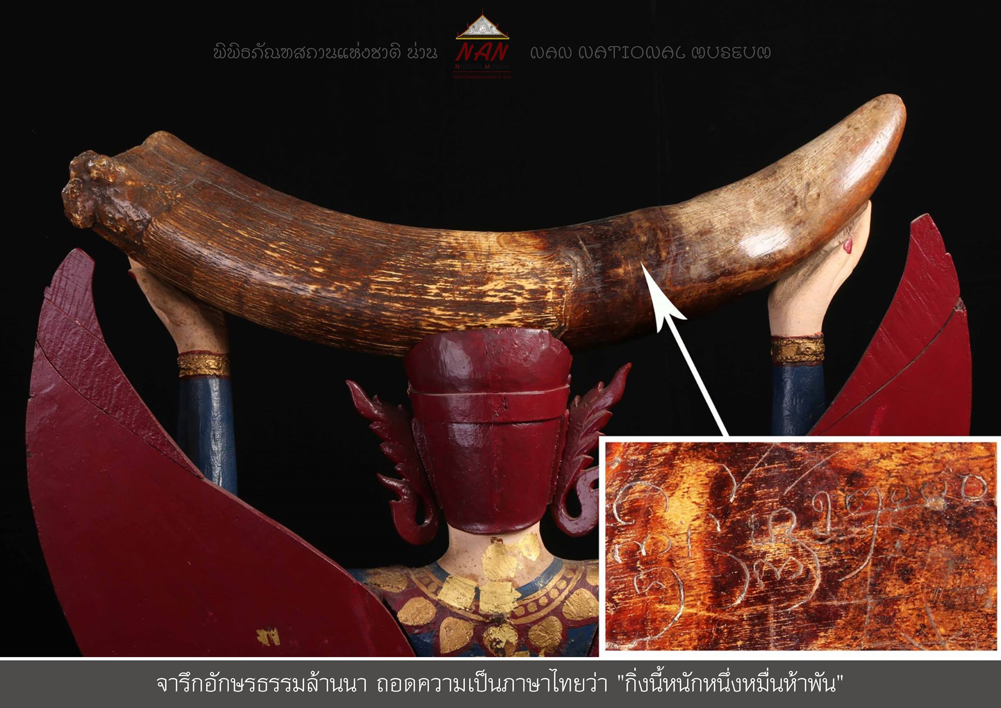 --- ส่วนฐานที่เป็นครุฑแบกรับงาช้างอยู่นั้น ทำจากไม้สักทั้งท่อน สร้างขึ้นในพุทธศักราช ๒๔๖๙ เนื่องจากในช่วงเวลานั้นมีข่าวว่าเจ้าเมืองทางเหนือบางเมืองแข็งข้อก่อกบฏ เจ้าเมืองน่านจึงให้ทำครุฑขึ้นมาแบกงาช้างดำ วัตถุคู่บ้านคู่เมือง เพื่อเป็นการแสดงสัญลักษณ์ให้เห็นว่า นครน่านยังจงรักภักดีต่อราชวงศ์จักรีแห่งกรุงรัตนโกสินทร์ไม่เสื่อมคลาย
