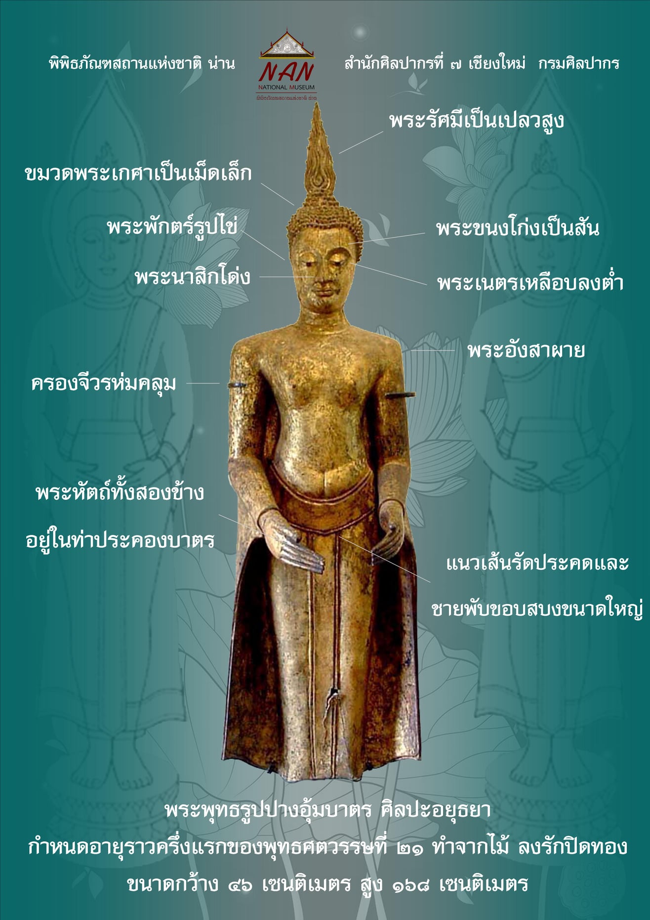 --- พระพุทธรูปปางอุ้มบาตร ศิลปะอยุธยา กำหนดอายุราวครึ่งแรกของพุทธศตวรรษที่ ๒๑ ทำจากไม้ ลงรักปิดทอง ขนาดกว้าง ๔๖ เซนติเมตร สูง ๑๖๘ เซนติเมตร องค์พระพุทธรูปประทับยืน ยื่นพระหัตถ์ทั้งสองประคองบาตรไว้ทางด้านหน้า พระพักตร์รูปไข่ พระขนงโก่งเป็นสัน พระเนตรเหลือบลงต่ำ พระนาสิกโด่ง ขมวดพระเกศาเป็นเม็ดเล็ก พระรัศมีเป็นเปลวสูง พระอังสาผาย บั้นพระองค์เล็ก ครองจีวรห่มคลุม แลเห็นแนวเส้นรัดประคดและชายพับขอบสบงขนาดใหญ่ทางด้านหน้า