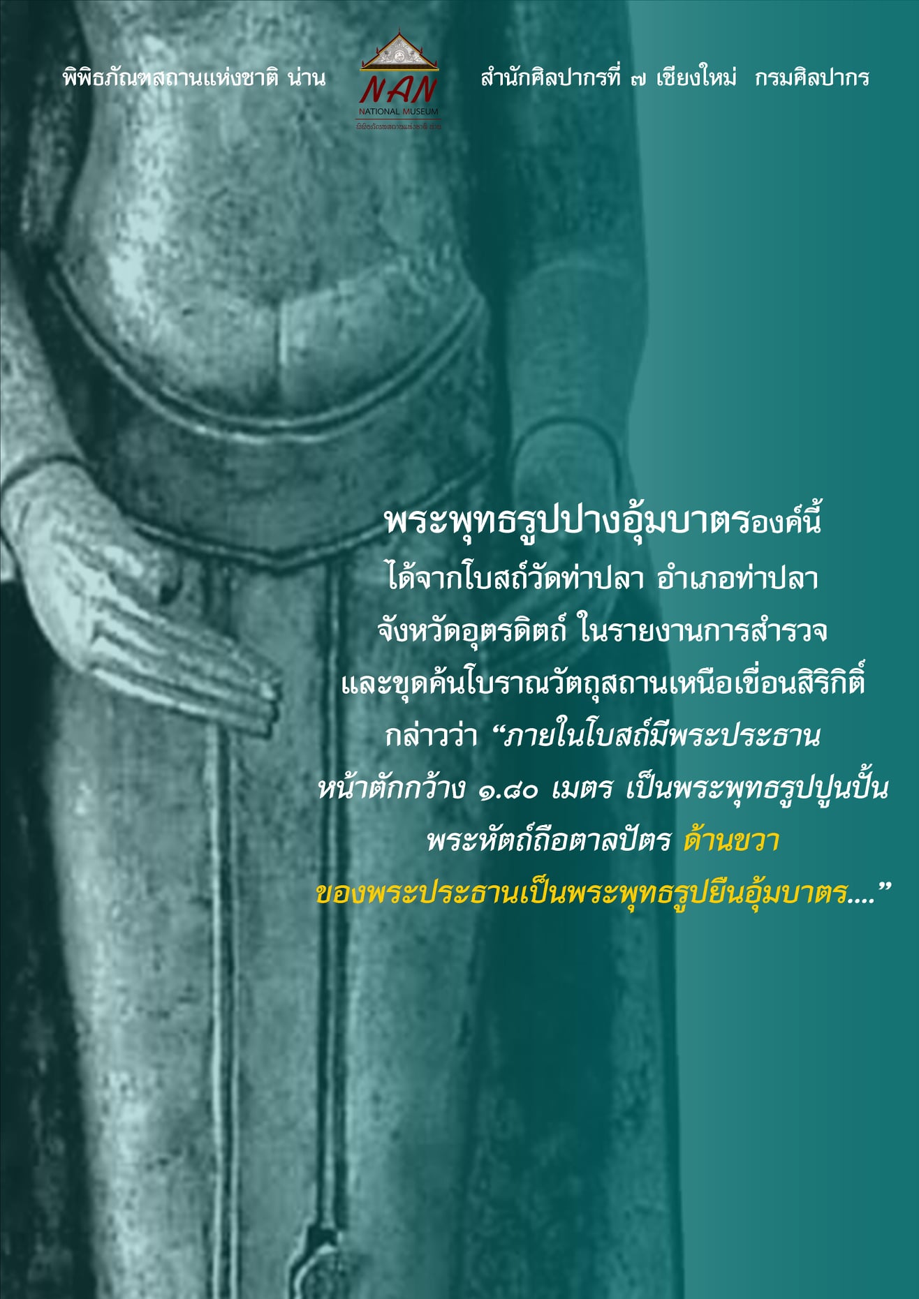 --- ปัจจุบัน พระพุทธรูปปางอุ้มบาตร จากวัดท่าปลา เหนือเขื่อนสิริกิติ์ จังหวัดอุตรดิตถ์องค์นี้ ได้จัดแสดง ณ ห้องนิทรรศการชั้นบนของพิพิธภัณฑสถานแห่งชาติ น่าน