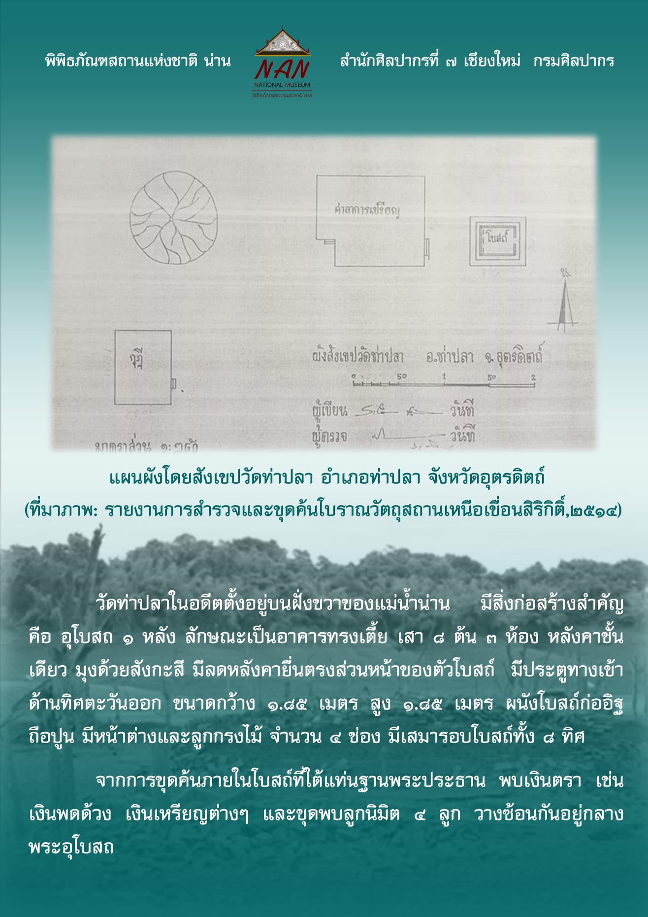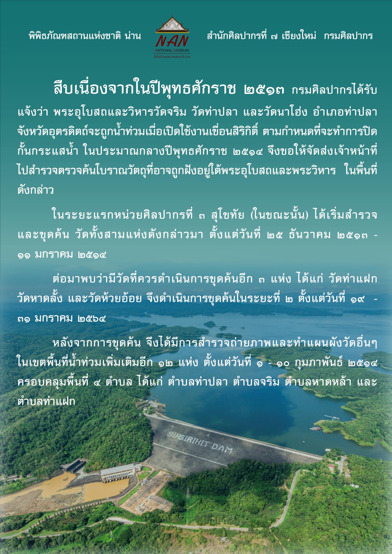--- สืบเนื่องจากในปีพุทธศักราช ๒๕๑๓ กรมศิลปากรได้รับแจ้งว่า พระอุโบสถและวิหารวัดจริม วัดท่าปลา และวัดนาโฮ่ง อำเภอท่าปลา จังหวัดอุตรดิตถ์จะถูกน้ำท่วมเมื่อเปิดใช้งานเขื่อนสิริกิติ์ ตามกำหนดที่จะทำการปิดกั้นกระแสน้ำ ในประมาณกลางปีพุทธศักราช ๒๕๑๔ จึงขอให้จัดส่งเจ้าหน้าที่ไปสำรวจตรวจค้นโบราณวัตถุที่อาจถูกฝังอยู่ใต้พระอุโบสถและพระวิหาร ในพื้นที่ดังกล่าว ในระยะแรกหน่วยศิลปากรที่ ๓ สุโขทัย (ในขณะนั้น) ได้เริ่มสำรวจและขุดค้น วัดทั้งสามแห่งดังกล่าวมา ตั้งแต่วันที่ ๒๕ ธันวาคม ๒๕๑๓ - ๑๑ มกราคม ๒๕๑๔ ต่อมาพบว่ามีวัดที่ควรดำเนินการขุดค้นอีก ๓ แห่ง ได้แก่ วัดท่าแฝก วัดหาดลั้ง และวัดห้วยอ้อย จึงดำเนินการขุดค้นในระยะที่ ๒ ตั้งแต่วันที่ ๑๙ - ๓๑ มกราคม ๒๕๖๔ และหลังจากการขุดค้น จึงได้มีการสำรวจถ่ายภาพและทำแผนผังวัดอื่นๆ ในเขตพื้นที่น้ำท่วมเพิ่มเติมอีก ๑๒ แห่ง ตั้งแต่วันที่ ๑ - ๑๐ กุมภาพันธ์ ๒๕๑๔ ครอบคลุมพื้นที่ ๔ ตำบล ได้แก่ ตำบลท่าปลา ตำบลจริม ตำบลหาดหล้า และตำบลท่าแฝก