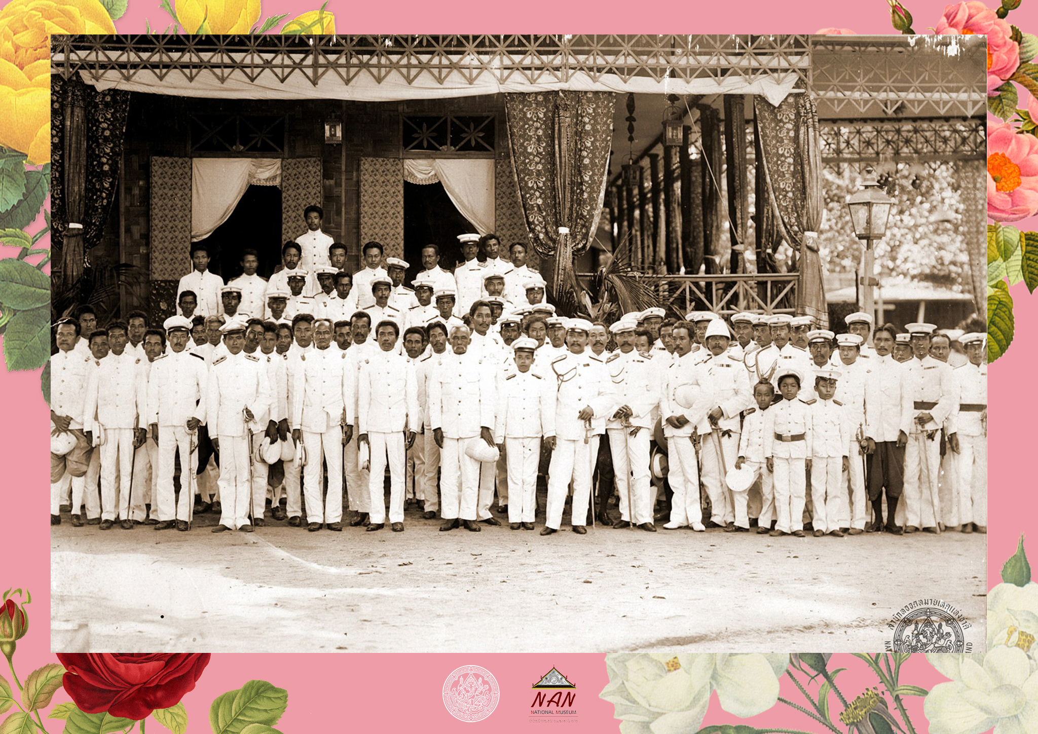 ภาพถ่ายพระบาทสมเด็จพระจุลจอมเกล้าเจ้าอยู่หัวฉายพระรูปร่วมกับพระบรมวงศานุวงศ์ ข้าราชการและเจ้าเมืองประเทศราช เจ้าเมืองล้านนาที่มาเฝ้ารับเสด็จ ณ พลับพลาที่ประทับเมืองอุตรดิตถ์ หน้าพลับพลารับเสด็จหน้าวัดวังเตาหม้อ (วัดท่าถนน) พ.ศ. ๒๔๔๔ เมื่อคราวเสด็จมณฑลฝ่ายเหนือ โดยแถวหน้านับจากซ้าย-ขวา