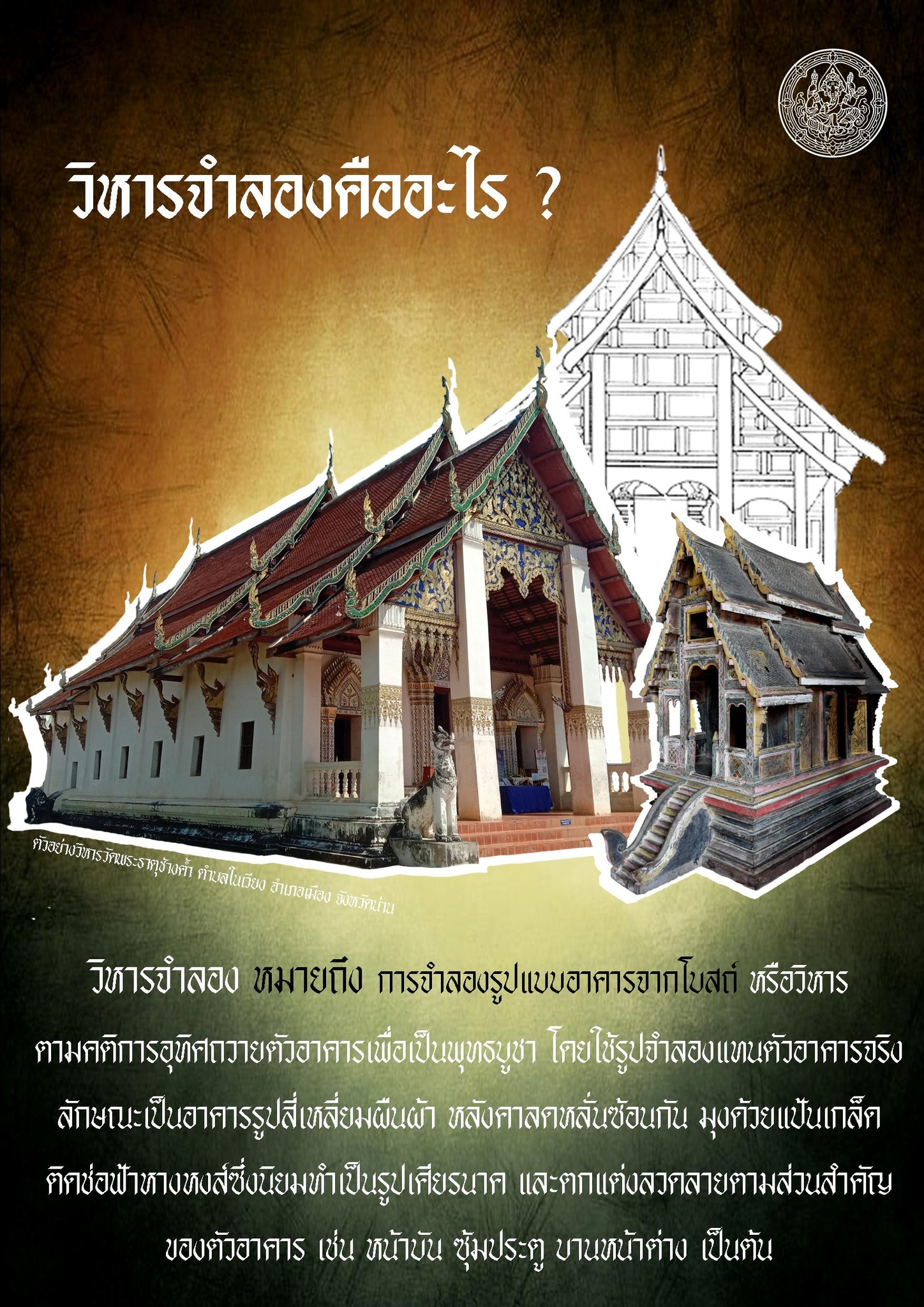 --- วิหารจำลองวัดนาซาว ตำบลนาซาว อำเภอเมือง จังหวัดน่าน... วิหารจำลอง หมายถึง การจำลองรูปแบบอาคารจากโบสถ์ หรือวิหาร ตามคติการอุทิศถวายตัวอาคารเพื่อเป็นพุทธบูชา โดยใช้รูปจำลองแทนตัวอาคารจริง ลักษณะเป็นอาคารรูปสี่เหลี่ยมผืนผ้า หลังคาลดหลั่นซ้อนกัน มุงด้วยแป้นเกล็ด ติดช่อฟ้า หางหงส์ซึ่งนิยมทำเป็นรูปเศียรนาค และตกแต่งลวดลายตามส่วนสำคัญของตัวอาคาร เช่น หน้าบัน ซุ้มประตู บานหน้าต่าง เป็นต้น