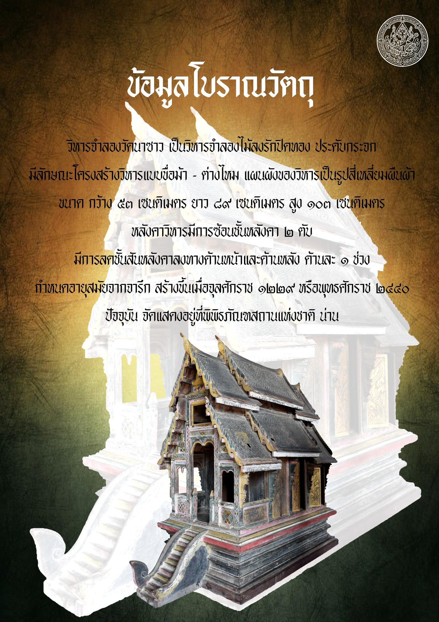 --- วิหารจำลองวัดนาซาว เป็นวิหารจำลองไม้ลงรักปิดทอง ประดับกระจก มีลักษณะโครงสร้างวิหารแบบขื่อม้าต่างไหม แผนผังของวิหารเป็นรูปสี่เหลี่ยมผืนผ้า ขนาด กว้าง ๕๓ เซนติเมตร ยาว ๘๙ เซนติเมตร สูง ๑๐๓ เซนติเมตร หลังคาวิหารมีการซ้อนชั้นหลังคา ๒ ตับ มีการลดชั้นสันหลังคาลงทางด้านหน้าและด้านหลัง ด้านละ ๑ ช่วง กำหนดอายุสมัยจากจารึก สร้างขึ้นเมื่อจุลศักราช ๑๒๒๙ หรือพุทธศักราช ๒๔๔๐ ปัจจุบัน จัดแสดงอยู่ที่พิพิธภัณฑสถานแห่งชาติ น่าน