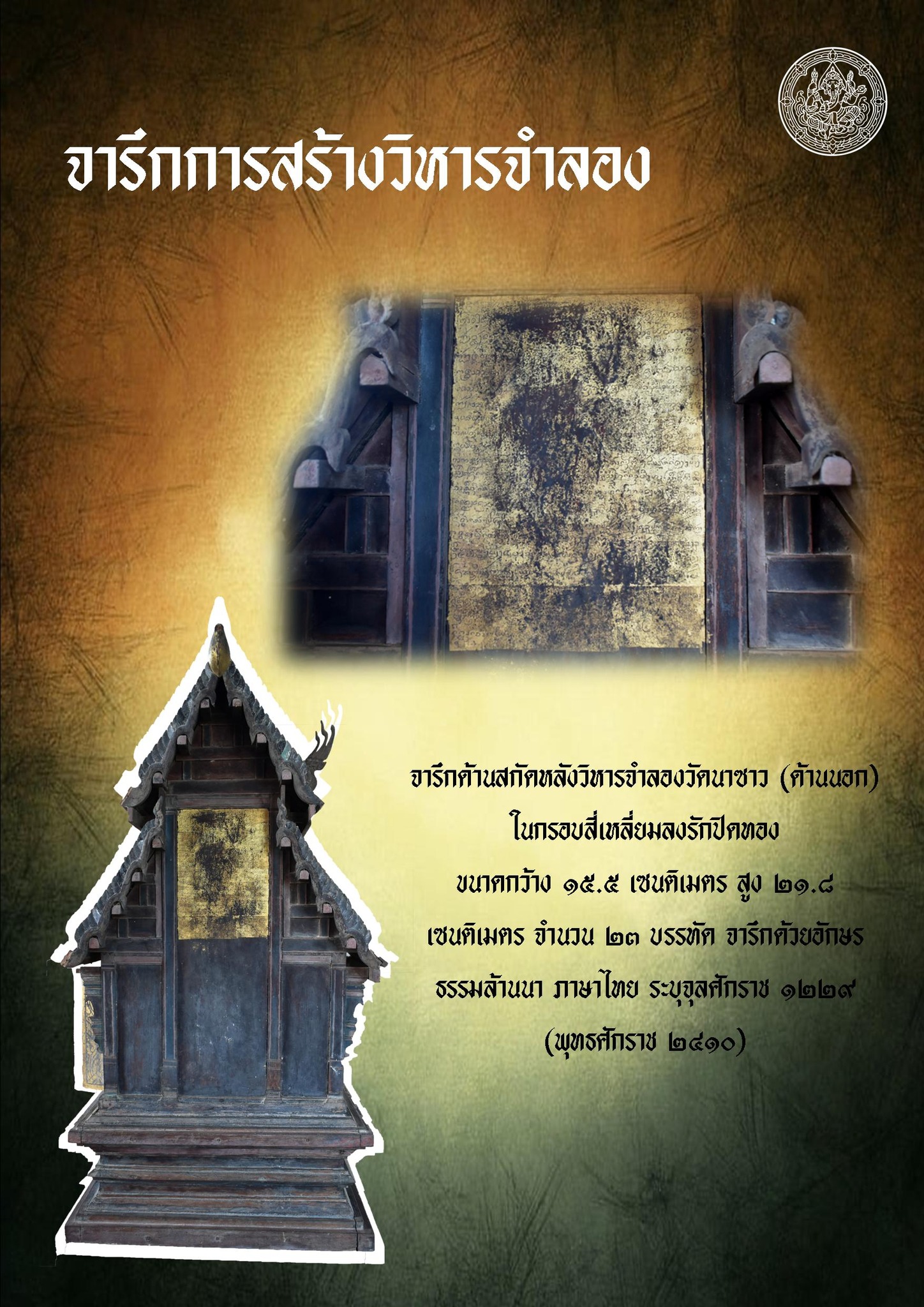 --- มีจารึกด้านสกัดหลังวิหารจำลองวัดนาซาว (ด้านนอก) ในกรอบสี่เหลี่ยมลงรักปิดทองขนาดกว้าง ๑๕.๕ เซนติเมตร สูง ๒๑.๘ เซนติเมตร จำนวน ๒๓ บรรทัด จารึกด้วยอักษรธรรมล้านนา ภาษาไทย ระบุจุลศักราช ๑๒๒๙ (พุทธศักราช ๒๔๑๐) ความในจารึกได้กล่าวถึงปีที่สร้าง ผู้สร้าง และการสร้างพระพุทธรูปไม้ภายในวิหาร ตลอดจนค่าใช้จ่ายต่างๆในการสร้าง และคำผาถนา หรือความปรารถนาของผู้สร้าง "ขอสุข ๓ ประการ มีนิพพานเจ้าเป็นยอดแท้ดีหลีจิงแก่ข้าทั้งหลายแด่เทอะ นิจฺจํ ธุวํ ธุวํ"
