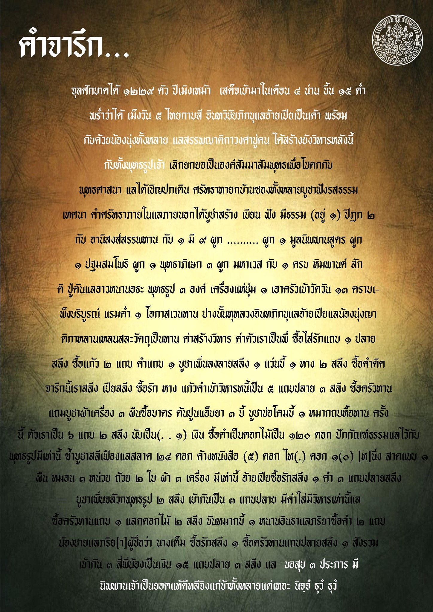 ๓ ไทยเมิงเหม้า ยามคัน …….. ภิกขุเกิดอายุได้ ๓๙ ศักได้ ๑๒๖๖ ตัว ………………... เพ็ง เม็ง.....ได้บวชพุทธรูปไม้คำเป็น …………...(ขอเอา)สุข ๓ ประการ มีนิพพาน (เป็นยอดแท้ดีหลี) นิพฺพาน ปจฺจโย โหนฺตุ เม นิจฺจํ เจ้ามี ๑๒๖๖ เดือน (๖) เพ็ง เม็งวัน…………………สี่ เดือน ๖”