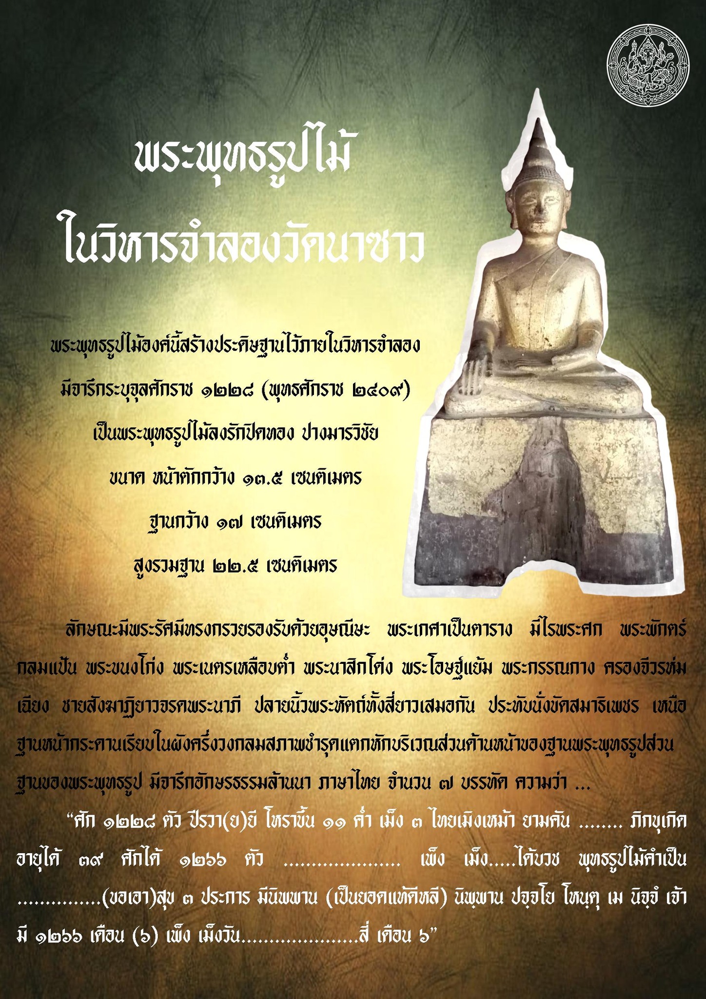 --- พระพุทธรูปไม้ที่สร้างประดิษฐานไว้ภายในวิหารจำลอง มีจารึกระบุจุลศักราช ๑๒๒๘ (พุทธศักราช ๒๔๐๙) เป็นพระพุทธรูปไม้ลงรักปิดทอง ปางมารวิชัย ขนาด หน้าตักกว้าง ๑๓.๕ เซนติเมตร ฐานกว้าง ๑๗ เซนติเมตร สูงรวมฐาน ๒๒.๕ เซนติเมตร ลักษณะมีพระรัศมีทรงกรวยรองรับด้วยอุษณีษะ พระเกศาเป็นตาราง มีไรพระศก พระพักตร์กลมแป้น พระขนงโก่ง พระเนตรเหลือบต่ำ พระนาสิกโด่ง พระโอษฐ์แย้ม พระกรรณกาง ครองจีวรห่มเฉียง ชายสังฆาฏิยาวจรดพระนาภี ปลายนิ้วพระหัตถ์ทั้งสี่ยาวเสมอกัน ประทับนั่งขัดสมาธิเพชร เหนือฐานหน้ากระดานเรียบในผังครึ่งวงกลม สภาพชำรุดแตกหักบริเวณส่วนด้านหน้าของฐานพระพุทธรูป