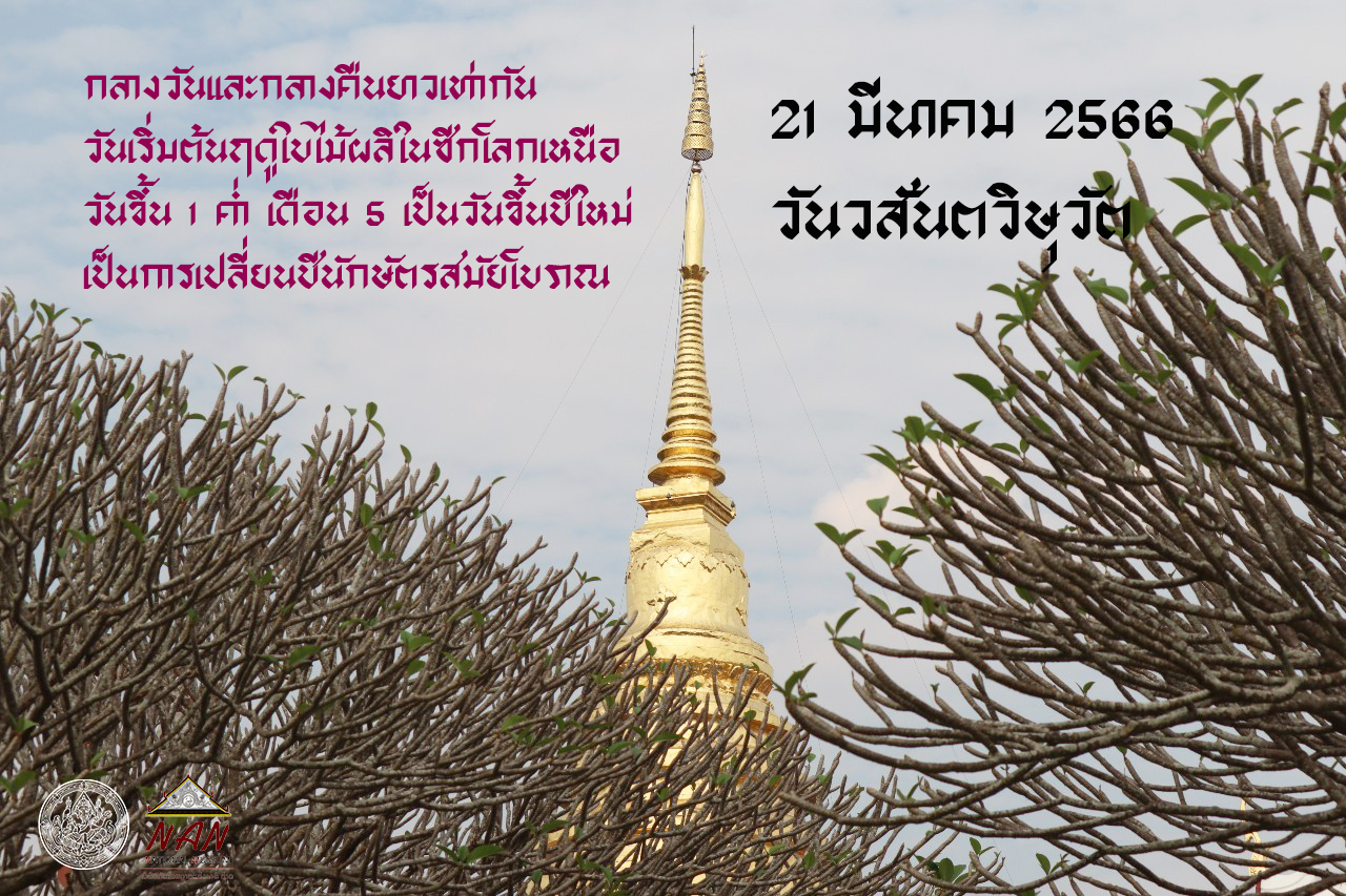 “วสันตวิษุวัต” (วะ-สัน-ตะ-วิ-สุ-วัด) (Vernal Equinox) ช่วงเวลากลางวันยาวเท่ากับกลางคืน คำว่า “วิษุวัต” (Equinox) เป็นภาษาสันสกฤตหมายถึง “จุดราตรีเสมอภาค” จุดที่ดวงอาทิตย์อยู่ในตำแหน่งตั้งฉากกับเส้นศูนย์สูตรของโลกพอดี ส่งผลให้เป็นวันที่มีเวลากลางวันและกลางคืนยาวเท่ากัน วันดังกล่าวเกิดขึ้นเพียง 2 ครั้งต่อปี คือช่วงเริ่มต้นฤดูใบไม้ผลิของซีกโลกเหนือ เรียกว่า วันวสันตวิษุวัต (Vernal Equinox) และช่วงเริ่มต้นฤดูใบไม้ร่วงของซีกโลกเหนือ เรียกว่า วันศารทวิษุวัต (Autumnal Equinox)
