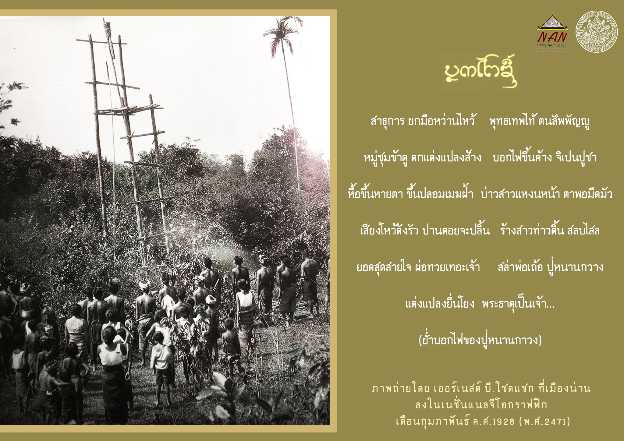 “...ในงานนมัสการพระธาตุเขาน้อย ประจำปีในปีนั้น เจ้ามหาพรหมสุรธาดาฯ เจ้าผู้ครองนครน่าน ท่านได้เสด็จไปนมัสการพระธาตุเขาน้อยตามปกติ ตามที่เคยทรงปฏิบัติมา และปรากฏว่าในปีนั้นมีบอกไฟที่นำไปจุดเป็นพุทธบูชามีจำนวนมาก จะจุดตามสาระคงจะจุดให้หมดในวันเดียวไม่ได้ คณะกรรมการจึงได้นำขึ้นไปจุดพร้อมกันหลายบอก ปรากฏว่าในการจุดครั้งนั้นมีบอกไฟนำขึ้นจุดพร้อมกันถึง ๑๐ บอก มีหลายขนาดบนค้างบอกไฟแน่นไปหมด เวลาจุดต้องใช้พลุลูดหนูแล่นตามสายเชือกขึ้นไปจุด ไม่มีใครกล้าขึ้นไปจุดเพราะกลัว ผมกางร่มนั่งดูบนหัวคันนากลางทุ่งนา แดดร้อนเปรี้ยง ห่างจากค้างบอกไฟไม่มากนัก ปรากฏว่าพลุลูกหนูที่จุดแล่นขึ้นไปนั้นไม่ติดเชื้อประทุ ที่หัวชนวนเงียบอยู่ แต่ไม่มีใครกล้าขึ้นไปบันไดค้างบอกไฟ เพื่อดูว่าทำไมไม่ติดเพราะกลัว ขณะนั้นมีกระทาชายคนหนึ่งเดินออกมาจากกลุ่มคนดูกลางทุ่ง ชายคนนั้นได้ถอดเสื้อออกแล้วปีนบันไดขึ้นไปดู คนดูโดยรอบต่างร้องห้ามปราม แต่แกไม่ฟัง พอปีนขึ้นไปถึงที่นั่งร้านสำหรับคนนำบอกไฟไปจุดเท้านั้น ไฟได้ลุกพรึบติดสายชนวนมะผาบขึ้นทันที ตอนนี้คนดูต่างอกสั่นขวัญแขวนไปตามๆกัน เกรงว่าชายคนนั้นคงต้องตายแน่ ๆ เพราะบอกไฟตั้ง ๑๐ บอก บางบอกก็แตกคาค้างอยู่ บางบอกก็เยี่ยว บางบอกก็ขึ้น สับสนอลม่านไปหมด ควันเฝ่าดินปืนที่พ่นออกมามืดมิด มองไม่เห็นชายผู้นั้นเลยแม้แต่น้อย แต่พอควันเริ่มจางลง จึงมองเห็นว่า ชายคนนั้นยืนรำป้ออยู่บนค้างบอกไฟนั้น ตัวดำมดหมี แล้วไต่บันไดลงมาอย่างคล่องแคล่วไม่แสดงอาการว่าเป็นอะไรเลย คนโดยรอบต่างวิ่งกรูเข้าไปดู ซึ่งรวมทั้งตัวผมด้วย ต่างคนต่างสำรวจดูตามเนื้อตัวของชายคนนั้นด้วยความเป้นห่วง ปรากฏว่าไม่ลวก ไม่ไหม้แม้แต่ผม บนศีรษะก็ไม่หงิกงอใดๆ ทั้งสิ้น งืดจริงๆ (ประหลาดใจ) ชายคนนั้นคือ นายธิ หนังแห้ง คนบ้านเจดีย์ ตำบลดู่ใต้ เป็นที่เลื่องลือในทางขมังเวทย์ ฟันแทงไม่เข้า จึงได้รับฉายา “หนังแห้ง” ผู้คนโจษขานกันวาที่ไฟไม่ลวก ไฟไม่ไหม้นั้นเพราะแกมีคาถา “โมคัลลานดับเปี๋ยว” (เปลวไฟ) ทั้งหมดนี้เรื่องจริงที่ผมได้เห็นมากับตา นับว่าเป็นเรื่องที่เหลือเชื่อเลยทีเดียว งือบ่อครับ...”