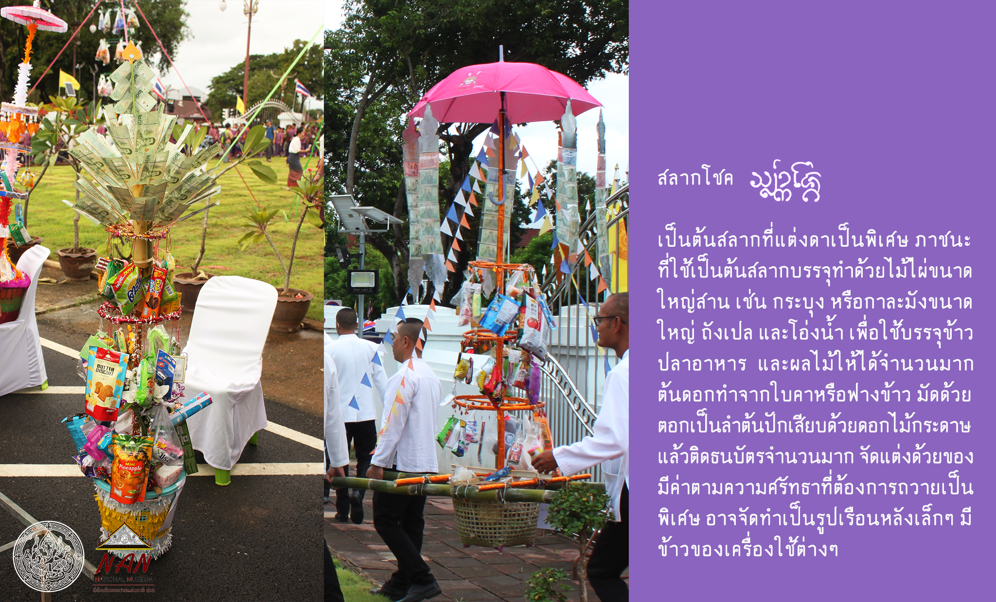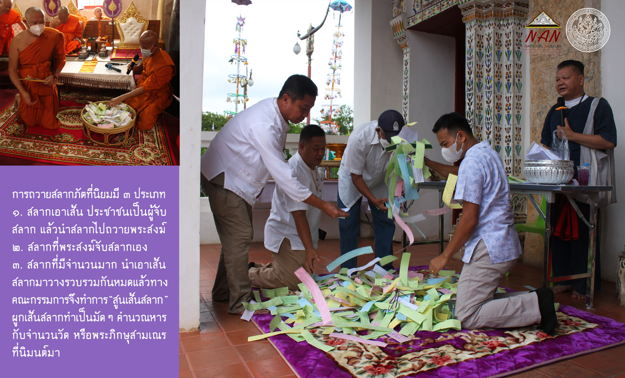๓. สลากที่มีจำนวนมาก นำเอาเส้นสลากมาวางรวมกันหมดแล้ว ทางคณะกรรมการจึงทำการ “สูนเส้นสลาก” ผูกเส้นสลากทำเป็นมัดๆ คำนวณหารกับจำนวนวัด หรือพระภิกษุสามเณรที่นิมนต์มา