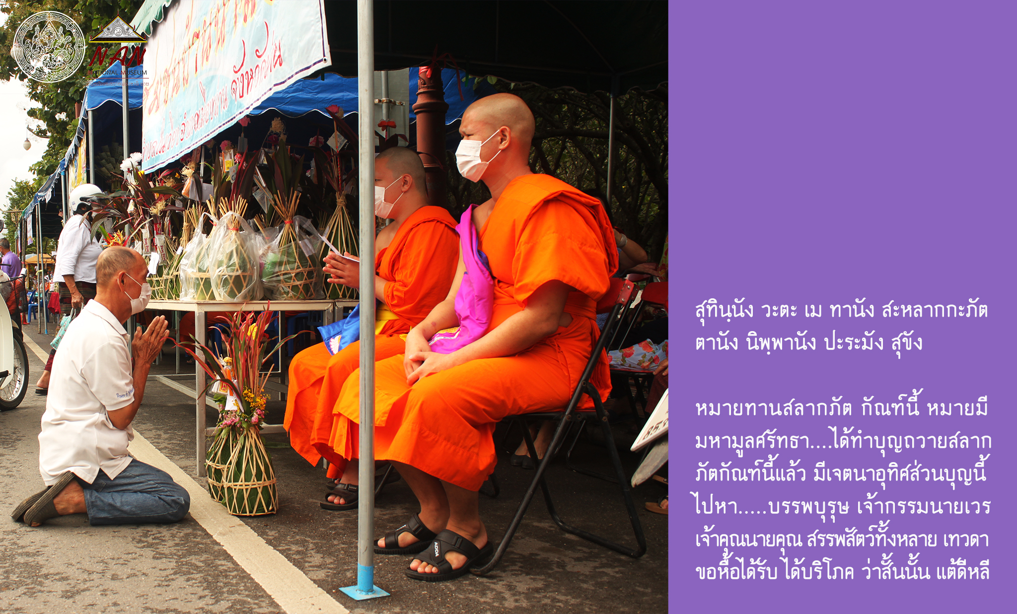 หมายทานสลากภัต กัณฑ์นี้ หมายมี มหามูลศรัทธา....ได้ทำบุญถวายสลากภัตรกัณฑ์นี้แล้ว มีเจตนาอุทิศส่วนบุญนี้ไปหา.....บรรพบุรุษ เจ้ากรรมนายเวร เจ้าคุณนายคุณ สรรพสัตว์ทั้งหลาย เทวดา ขอหื้อได้รับ ได้บริโภค ว่าสั้นนั้น แต้ดีหลี
