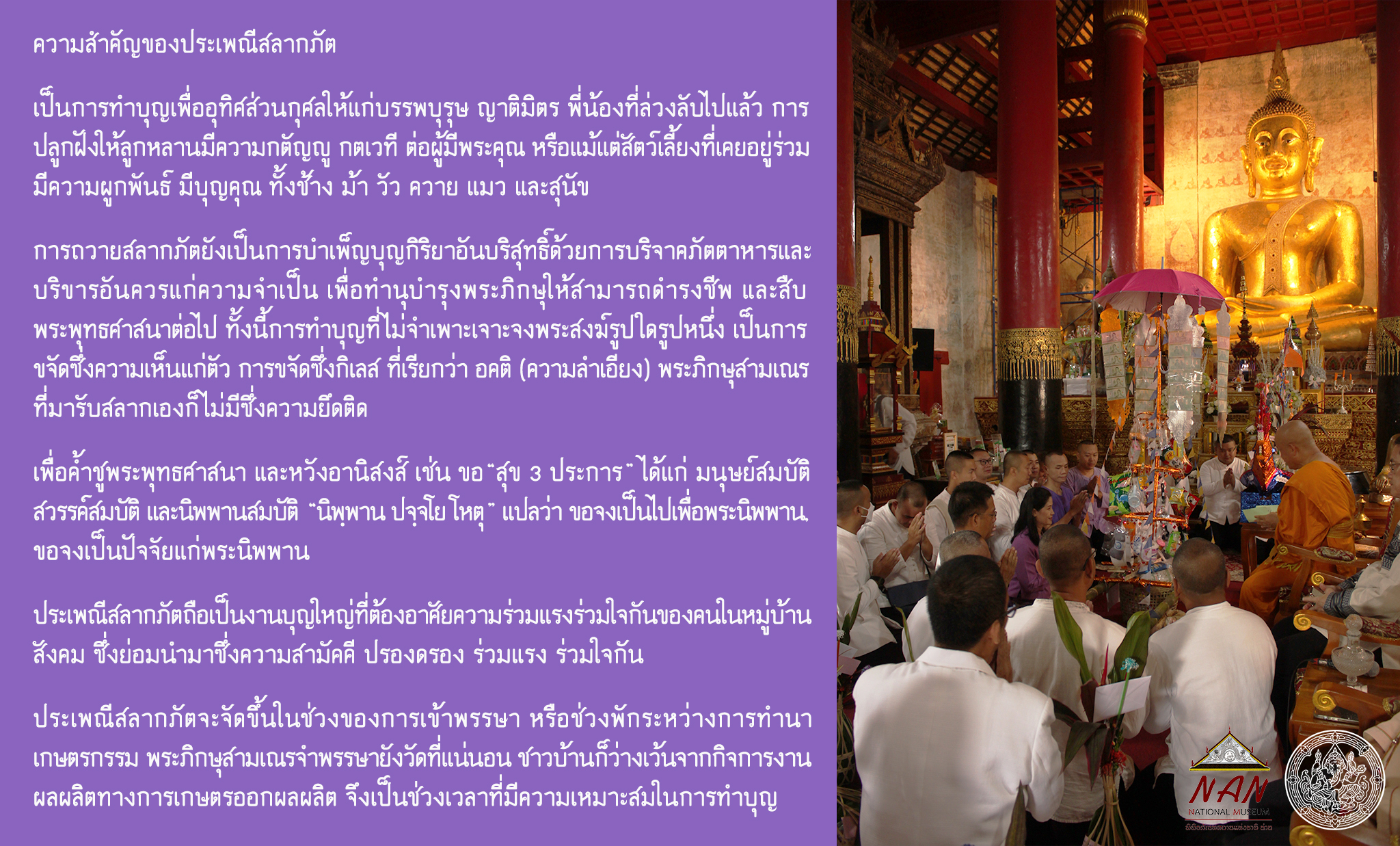 ประเพณีและธรรมเนียมถวายภัตตาหารแด่พระภิกษุด้วยวิธีถวายสลากภัตนี้ มาจากความเชื่อว่าจะช่วยให้ได้บุญกุศลมากกว่าการถวายภัตตาหารแด่พระสงฆ์โดยจำเพาะเจาะจง สลากภัตเป็นภัต ๑ ใน ๗ อย่าง ซึ่งสมเด็จพระผู้มีพระภาคทรงอนุญาตให้พระสงฆ์รับ จากพระไตรปิฎกเล่มที่ ๗ พระวินัยปิฎกเล่มที่ ๗ จุลวรรค ภาค ๒ พุทธานุญาตภัตร ความว่า
