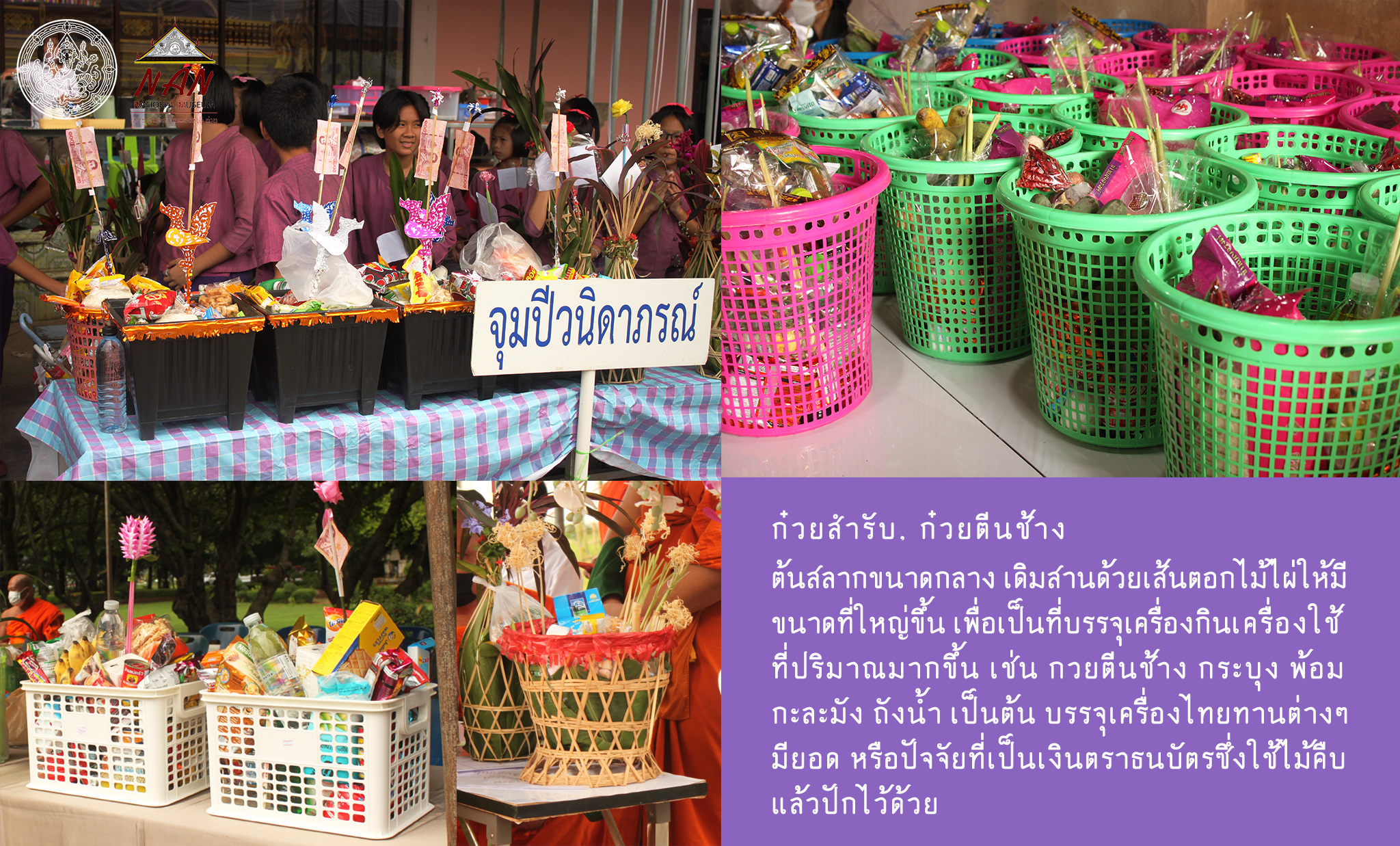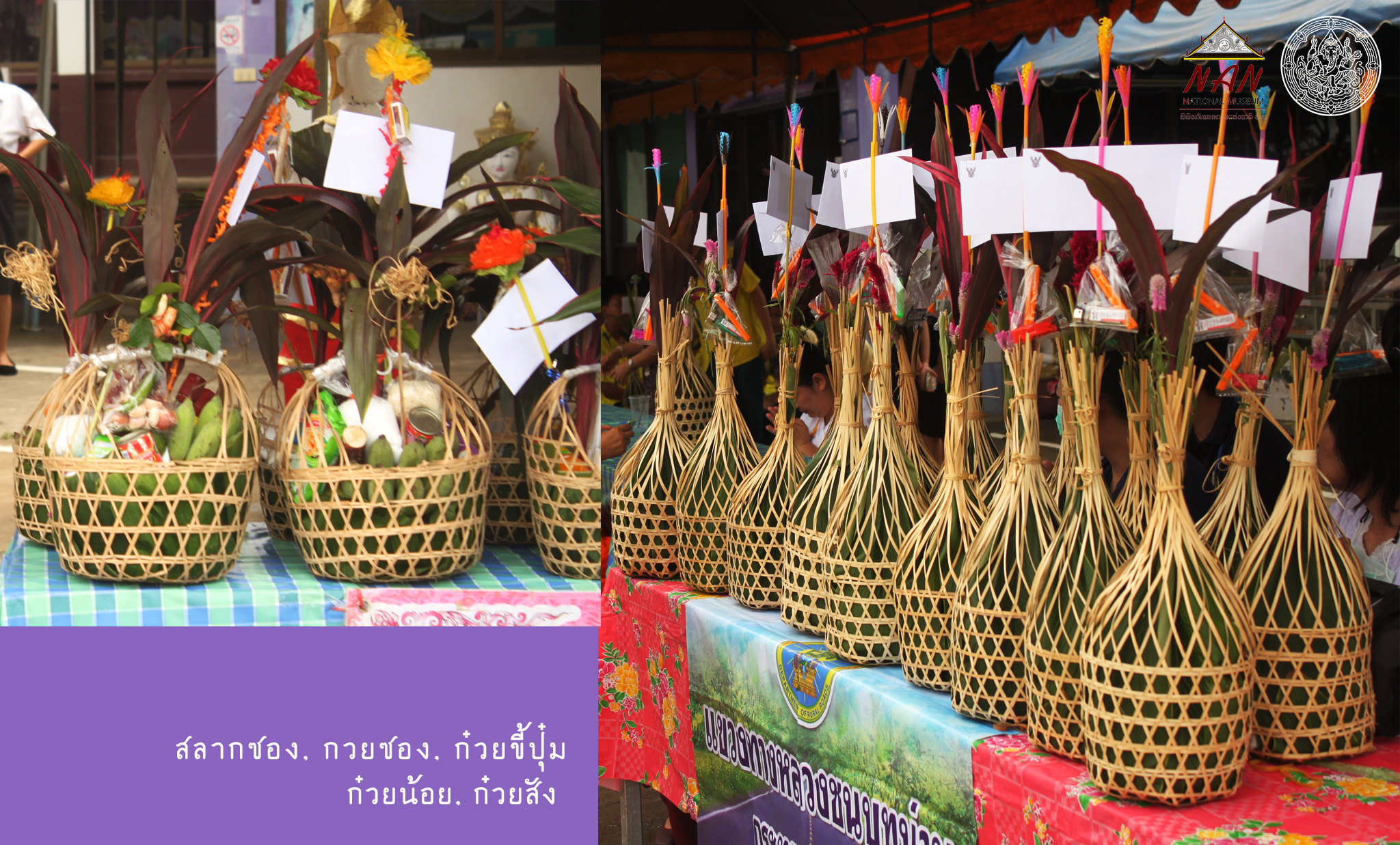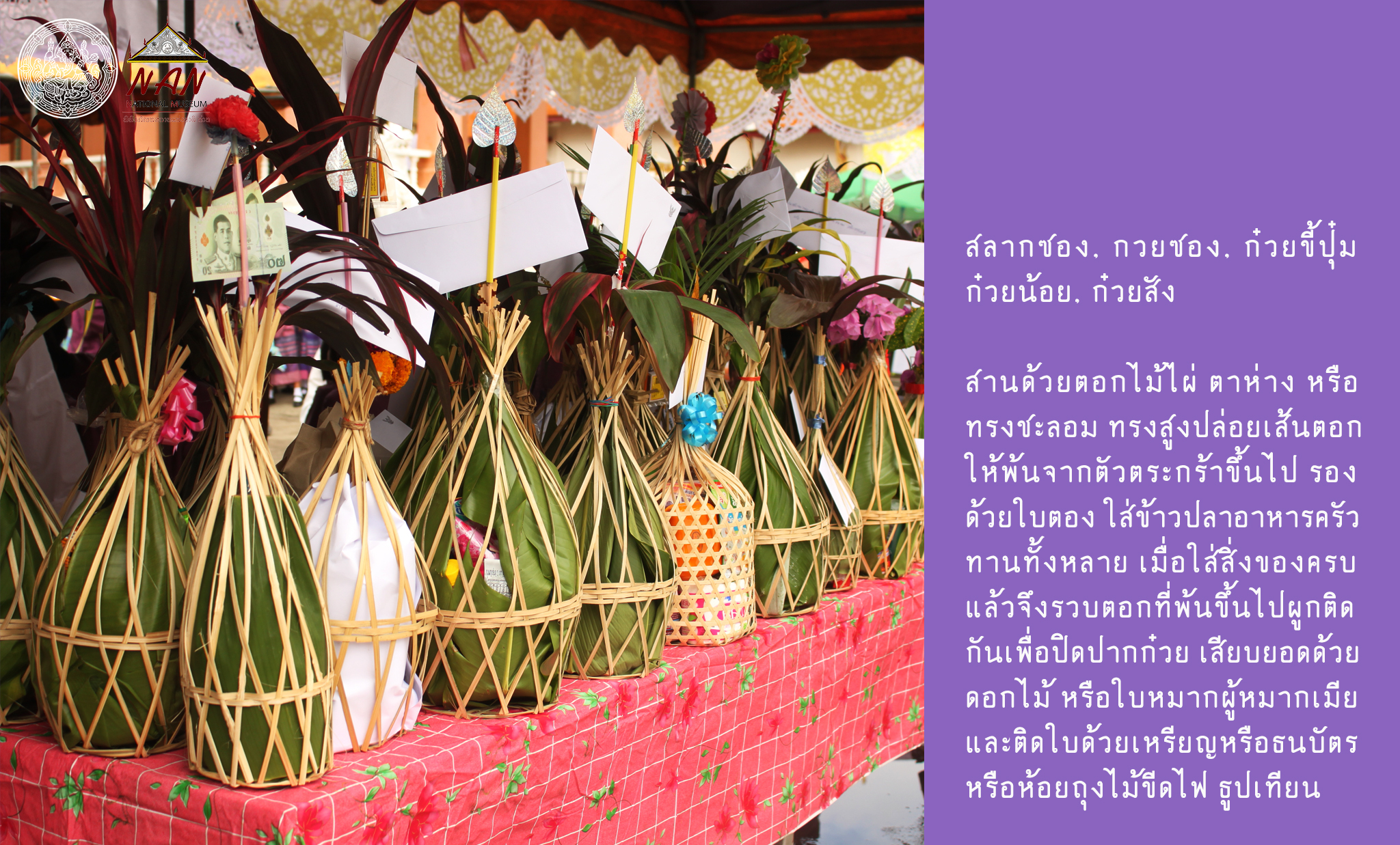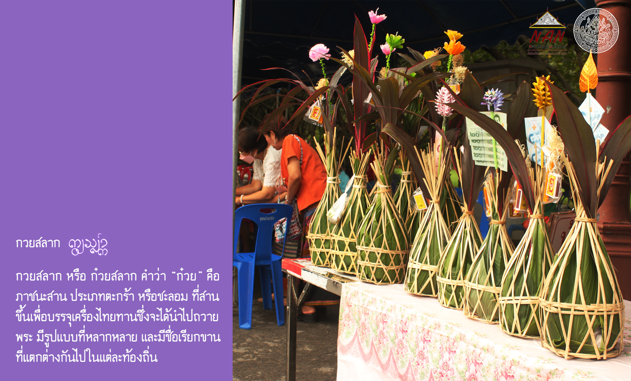 กวยสลาก หรือ ก๋วยสลาก คำว่า “ก๋วย” คือ ภาชนะสาน ประเภทตะกร้า หรือชะลอม ที่สานขึ้นเพื่อบรรจุเครื่องไทยทานซึ่งจะได้นำไปถวายพระ มีรูปแบบที่หลากหลาย และมีชื่อเรียกขานที่แตกต่างกันไปในแต่ละท้องถิ่น ประกอบด้วย