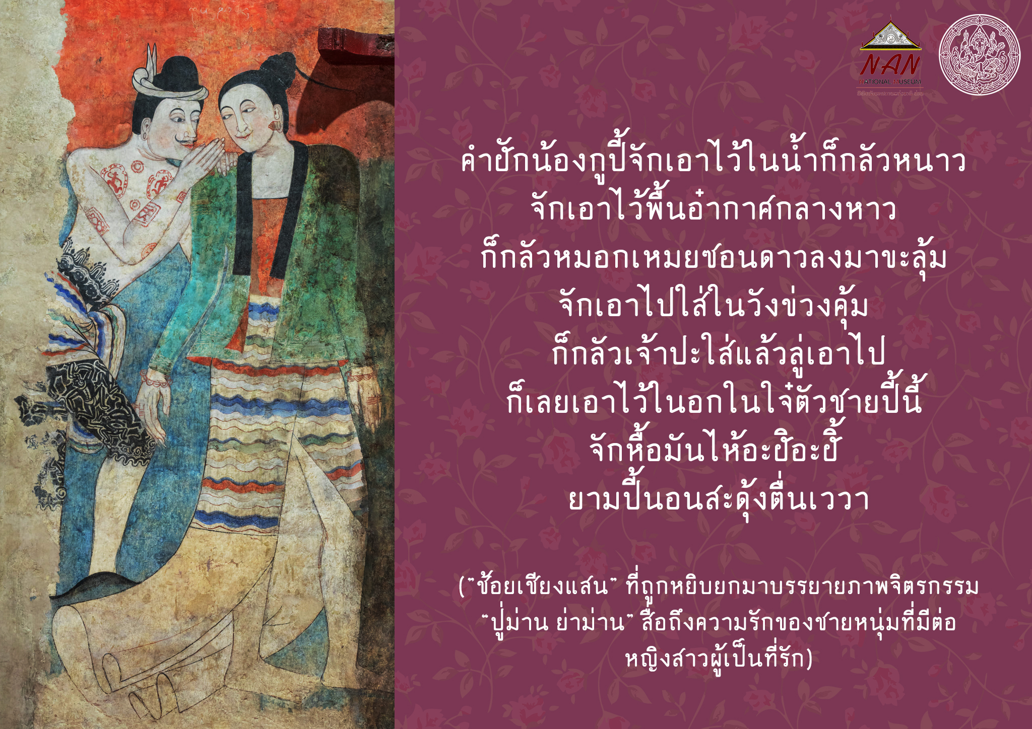 เมื่อทุกท่านมาเยี่ยมชมวัดภูมินทร์ จังหวัดน่าน พลาดไม่ได้จะต้องไปเยียมชม และถ่ายภาพ “กระซิบรัก” ที่ถูกหยิบยกขึ้นมาเป็นอีกหนึ่งไฮไลท์ หรือจุดเน้นที่สำคัญมามาเยือน โดยภาพดังกล่าวมีอักษรธรรมล้านนา หรือตัวเมืองสีขาว ระบุที่ด้านบนของภาพว่า “ปู่ม่าน ย่าม่าน” โดยคำว่าปู่ ย่า หมายถึง ผู้ชาย ผู้หญิง /พ่อ แม่ ส่วนคำว่า ม่าน หมายถึง พม่า เป็นภาพชายหนุ่มกับหญิงสาวกำลังทำท่าทาง “กระซิบกระซาบ” กัน จนเป็นที่มาของคำว่า #กระซิบรัก #กระซิบรักน่าน #กระซิบรักบันลือโลก
