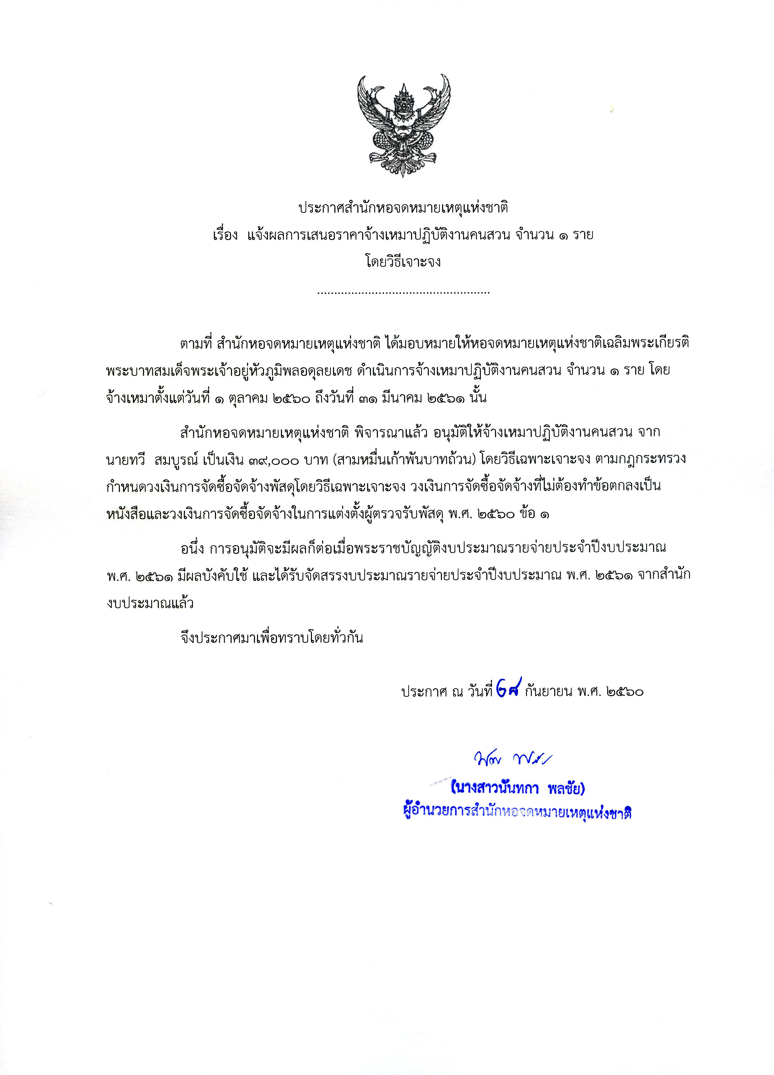 แจ้งผลการเสนอราคาจ้างเหมาปฏิบัติงานคนสวน จำนวน 1 ราย 13-2