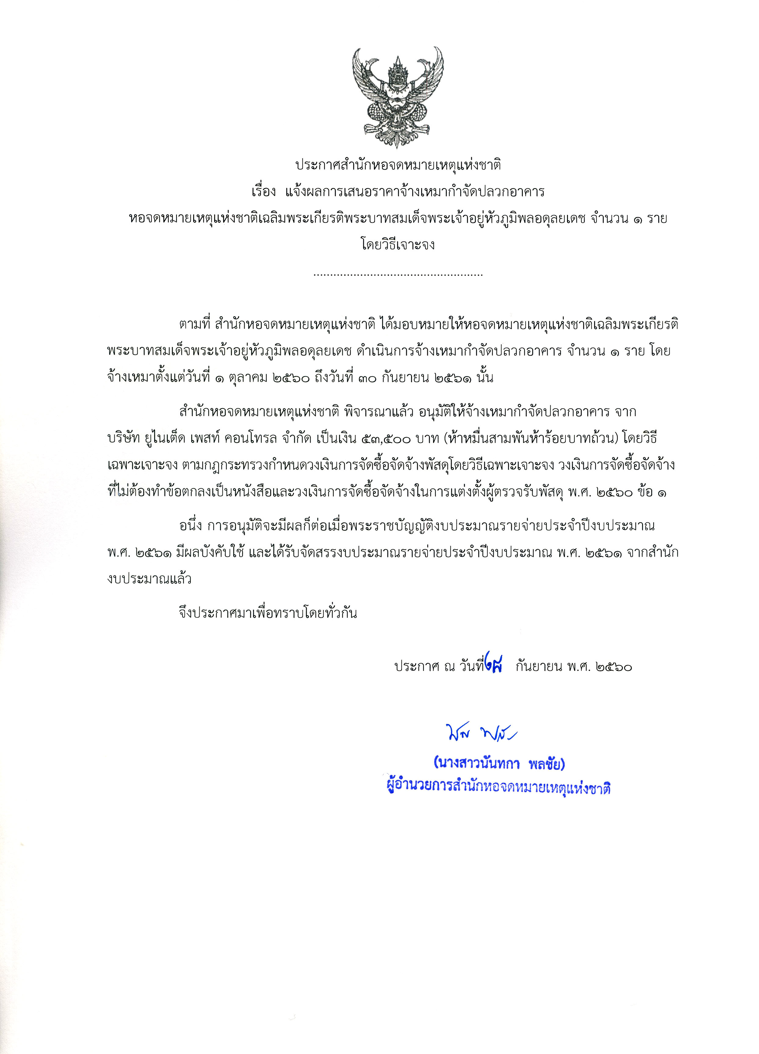 แจ้งผลการเสนอราคาจ้างเหมาบริการบำรุงลิฟต์ "ฮิตาชิ" จำนวน 1 ราย โดยวิธีเฉพาะเจาะจง