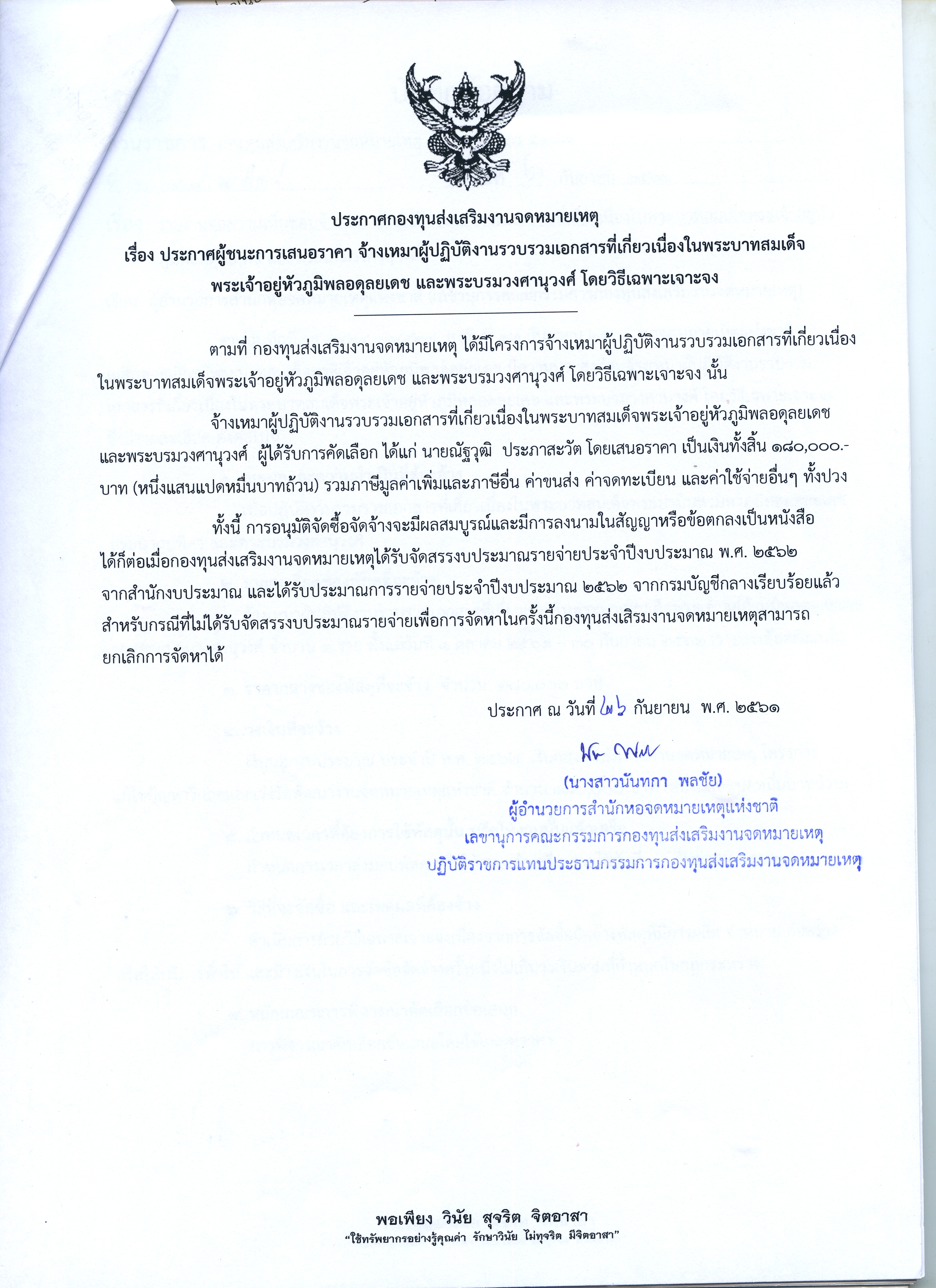 ประกาศผู้ชนะการเสนอราคา จ้างเหมาผู้ปฏิบัติงานรวบรวมเอกสารที่เกี่ยวเนื่องในพระบาทสมเด็จพระเจ้าอยู่หัวภูมิพลอดุลยเดชและพระบรมวงศานุวงศ์ โดยเฉพาะเจาะจง