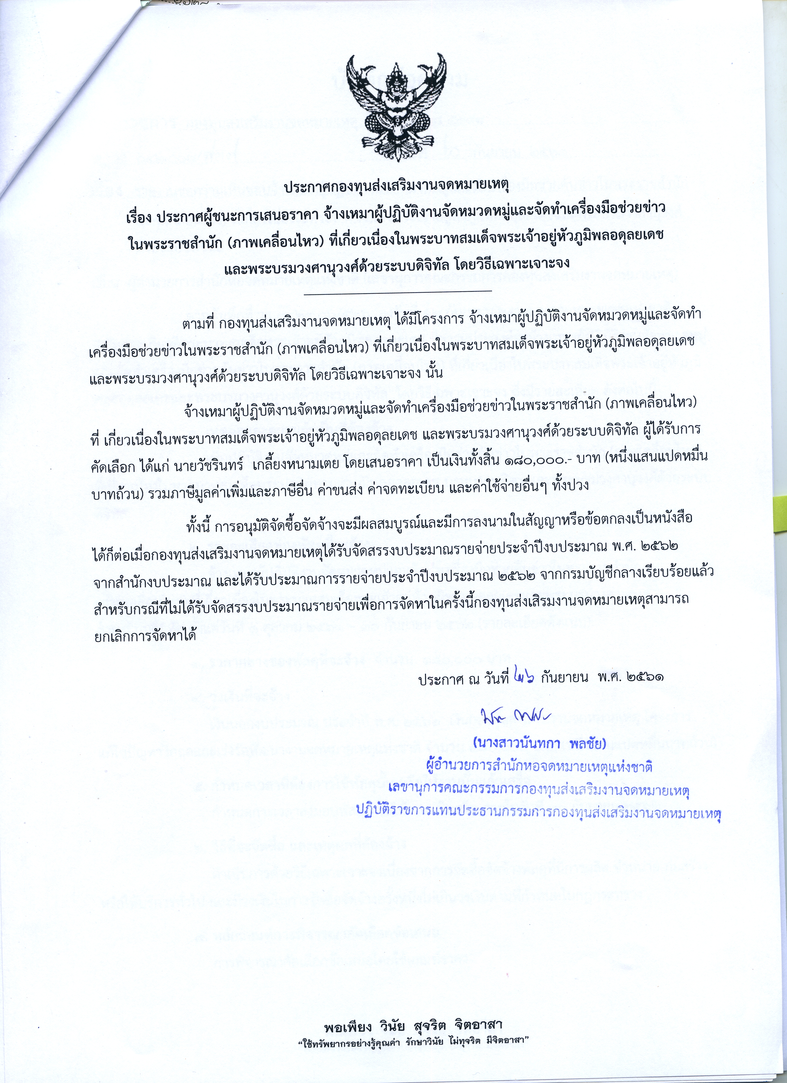 ประกาศผู้ชนะการเสนอราคา จ้างเหมาผู้ปฏิบัติงานจัดหมวดหมู่และจัดทำเครื่องมือช่วยค้นข่าวในพระราชสำนัก (ภาพเคลื่อนไหว) ที่เกี่ยวข้องในพระบาทสมเด็จพระเจ้าอยู่หัวภูมิพลอดุลยเดชและพระบรมวงศานุวงศ์ด้วยระบบดิจิทัล โดยเฉพาะเจาะจง