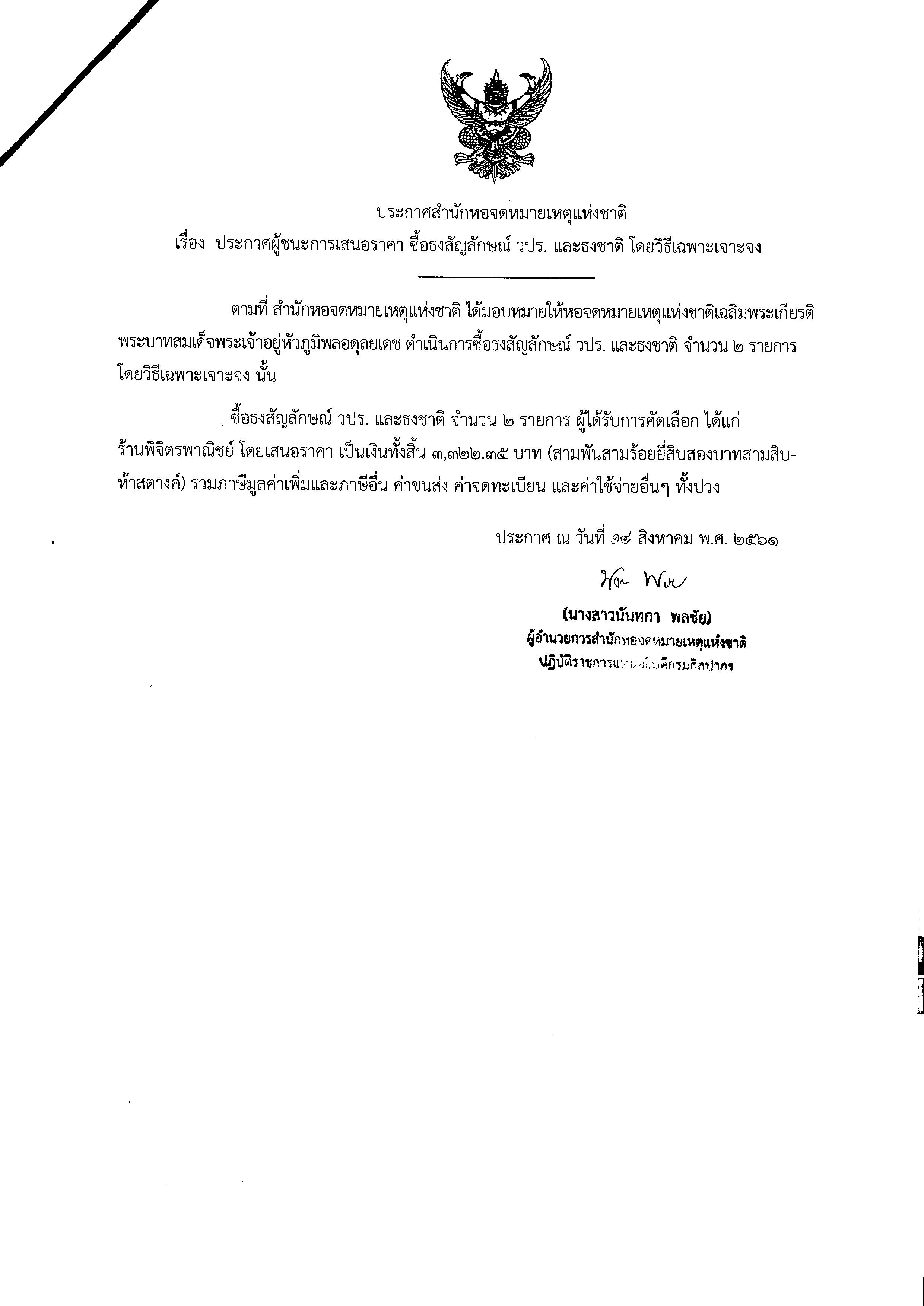 ประกาศผู้ชนะการเสนอราคาซื้อธงสัญลักษณ์ วปร. และธงชาติโดยวิธีเฉพาะเจาะจง