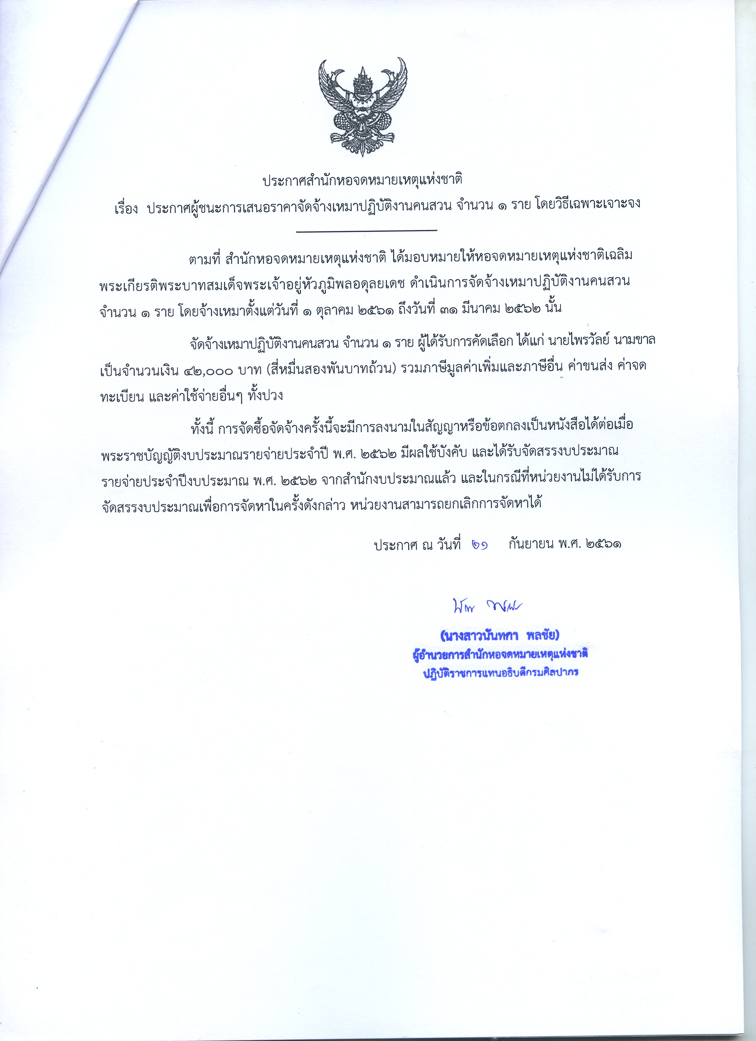ประกาศผู้ชนะการเสนอราคาจ้างเหมาปฏิบัติงานคนสวน จำนวน 1 ราย โดยวิธีเฉพาะเจาะจง 5